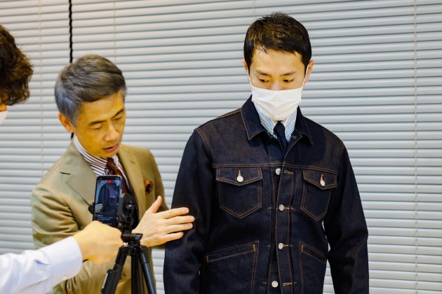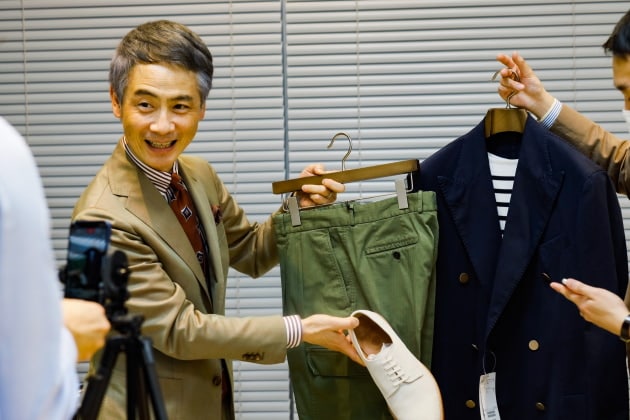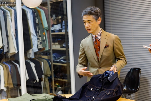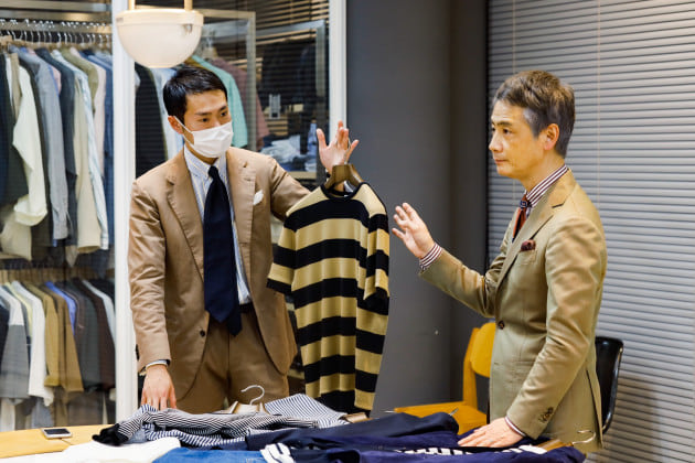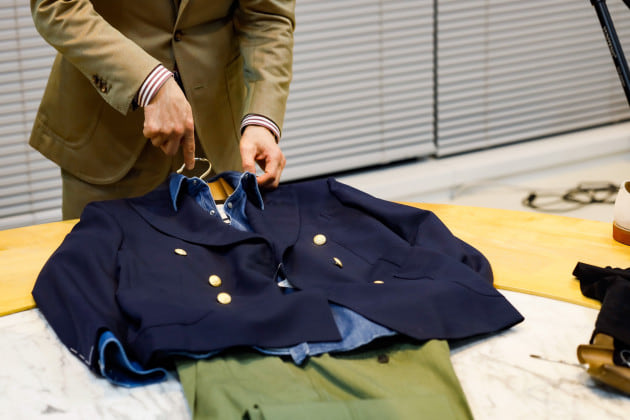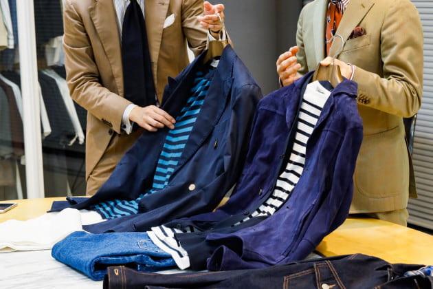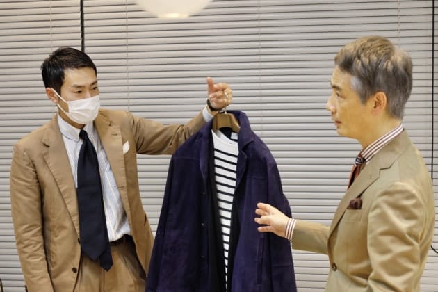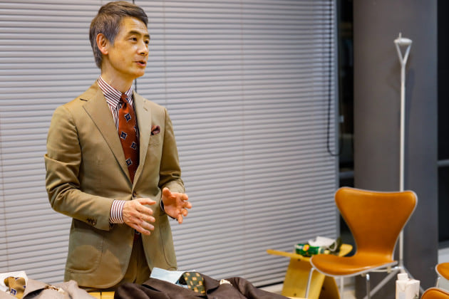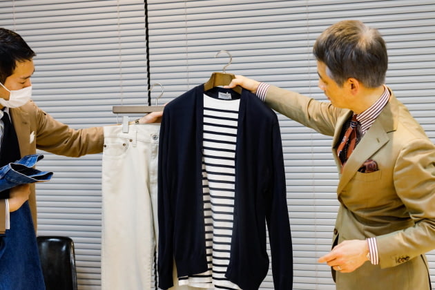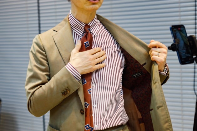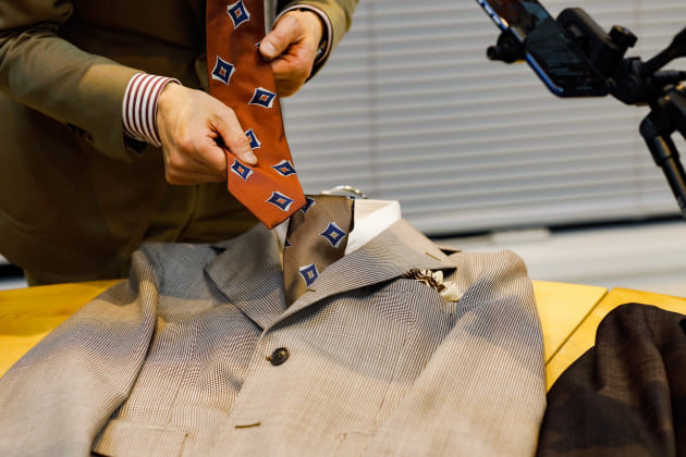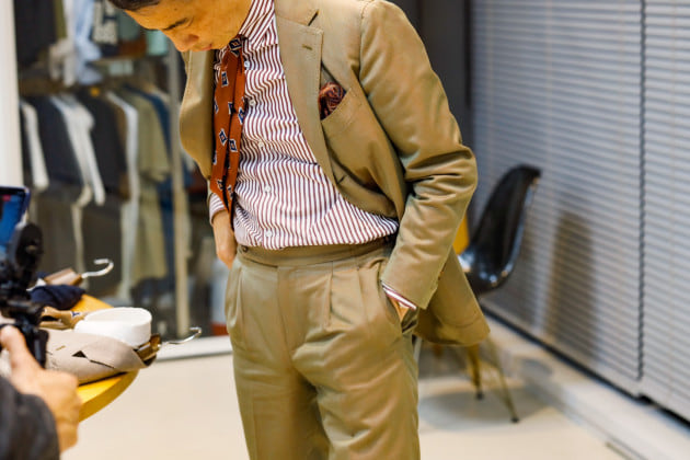 そこにサックスのクレリックシャツとジャカードタイ。色を拾ったシンプルな合わせながら、ヴィンテージ調のパターンがオーセンティックなルックスに。