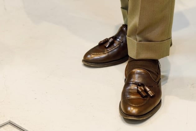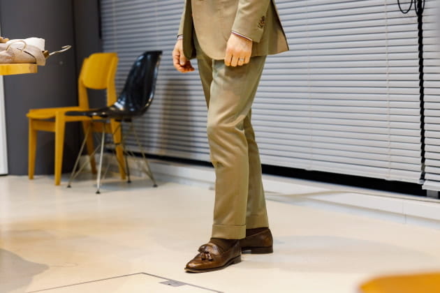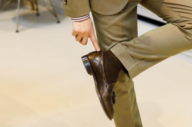 シューズはブラックのサイドエラスティック。ビスポークのようなディテールがスーツスタイルをこなれた雰囲気に。