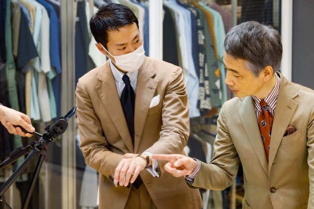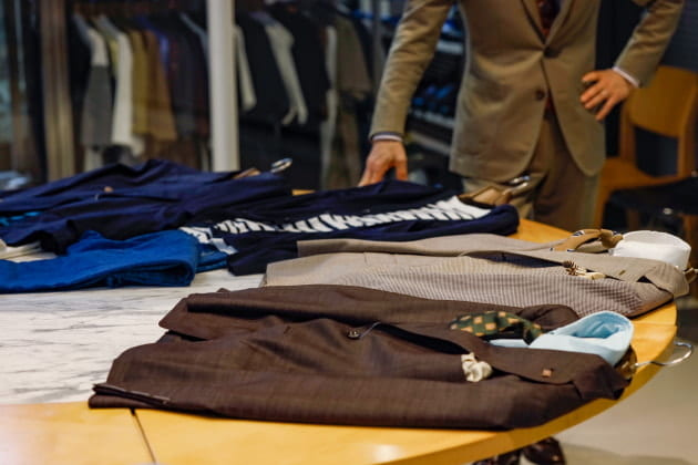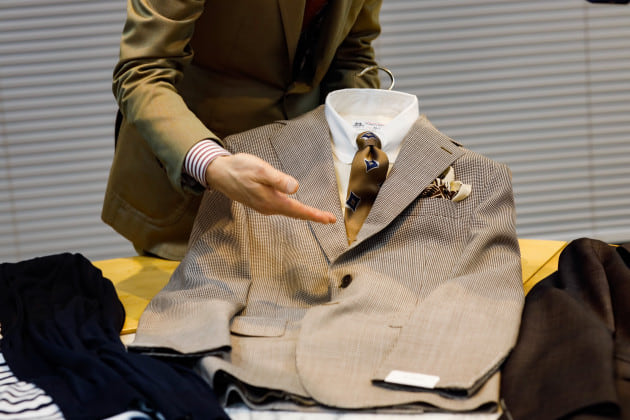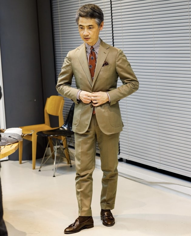 柔らかな仕立てながら端正な印象の<TAGLIATORE>のスーツは細かなチェックがポイント。シンプルな無地よりも奥行きのある雰囲気に。