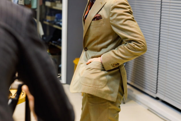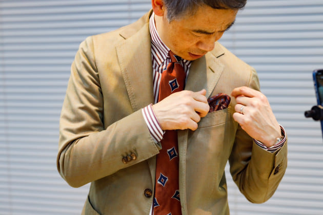 チーフもレトロなパターンをチョイス。スーツ、シャツと柄を抑えているのでここは足し算でアクセントを。