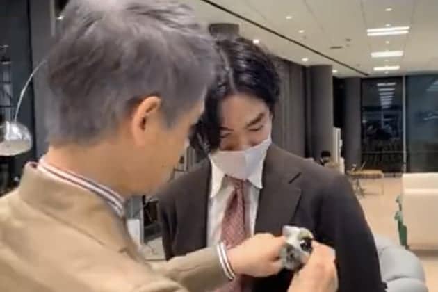 ネイビースーツにクレリックシャツ、ジャカードタイのクラシカルなコーディネート。