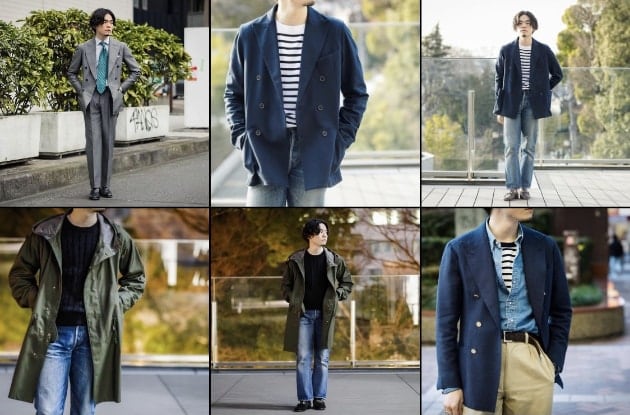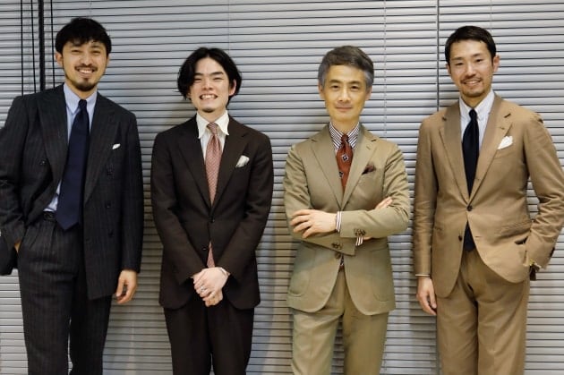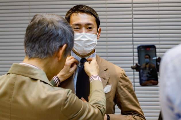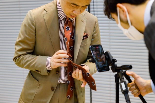 隙のないオーセンティックなネイビースーツスタイル。ネイビーで統一しつつ、ヴィンテージ調のブラックカラータイで今の空気感も取り入れています。