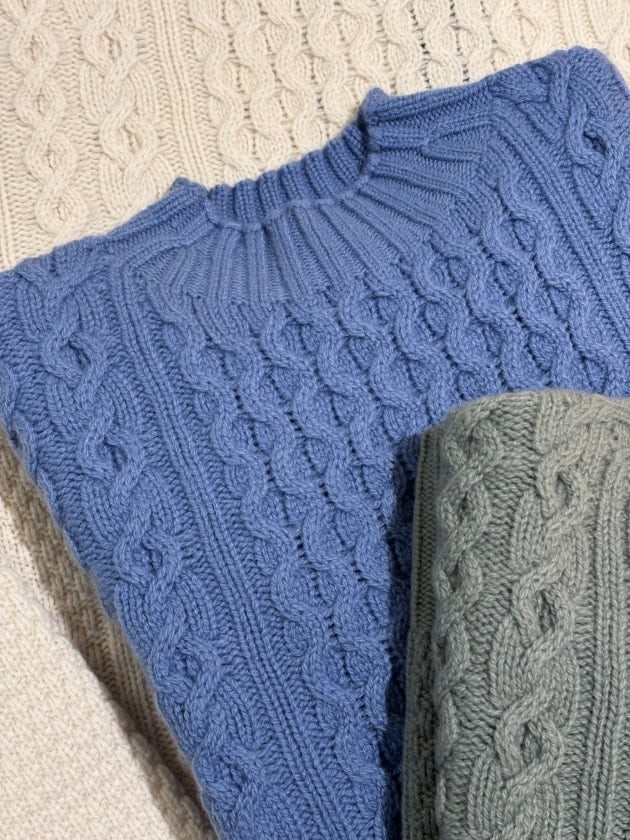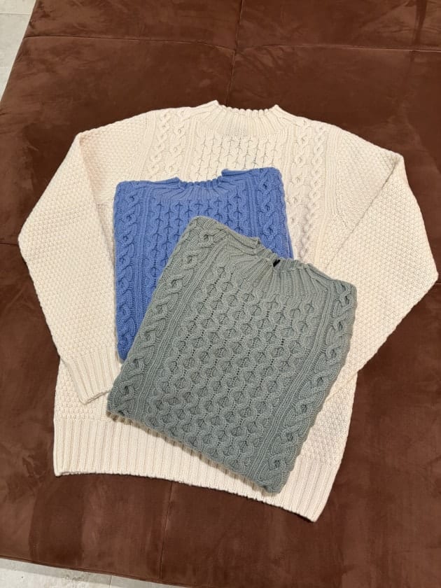 5ゲージアラン編みモックネックです。3色展開。最高級のスーパージーロンラムズウール100%です。