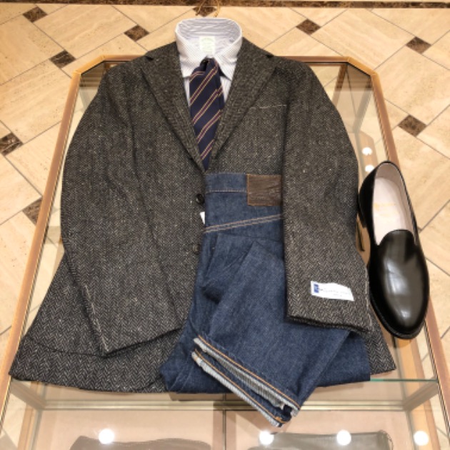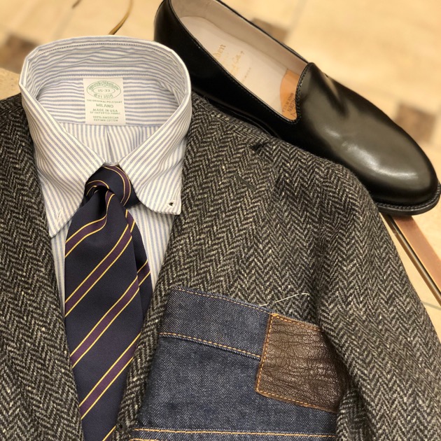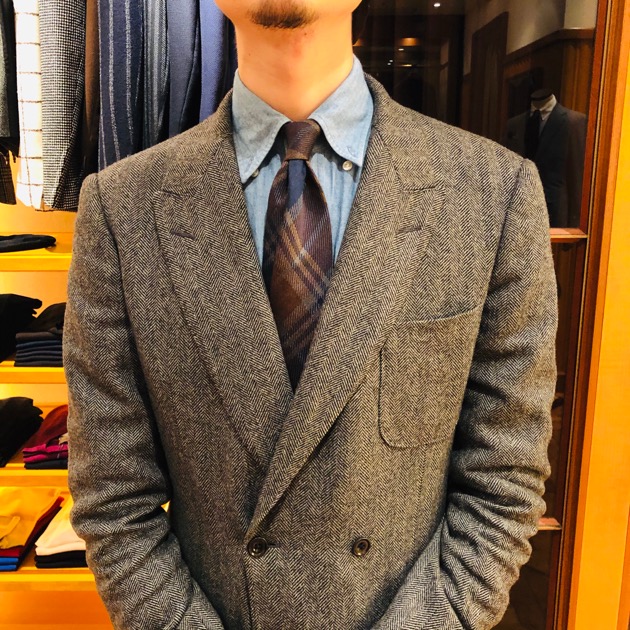 ワイルドさんはシンプルに着こなしたいそう。ボタンダウンシャツにニットタイのベーシックな合わせがジャケットの柄を引き立てます。