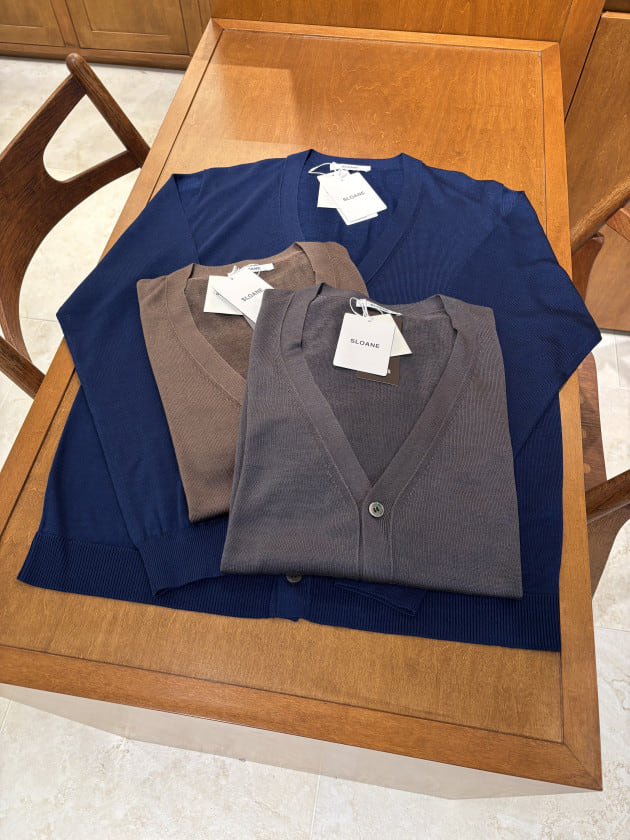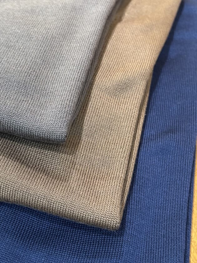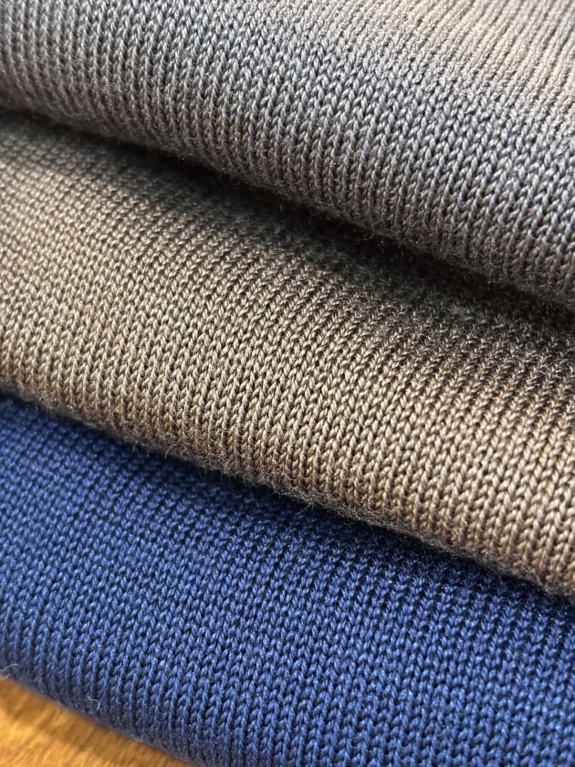 Triplofiloと呼ばれるメリノウール3プライ糸を使用したニットです。毛玉が出来にくい、シワになりにくい、デリケートコースでの洗濯機洗いが可能、と良いことづくめの特性を持ちます。