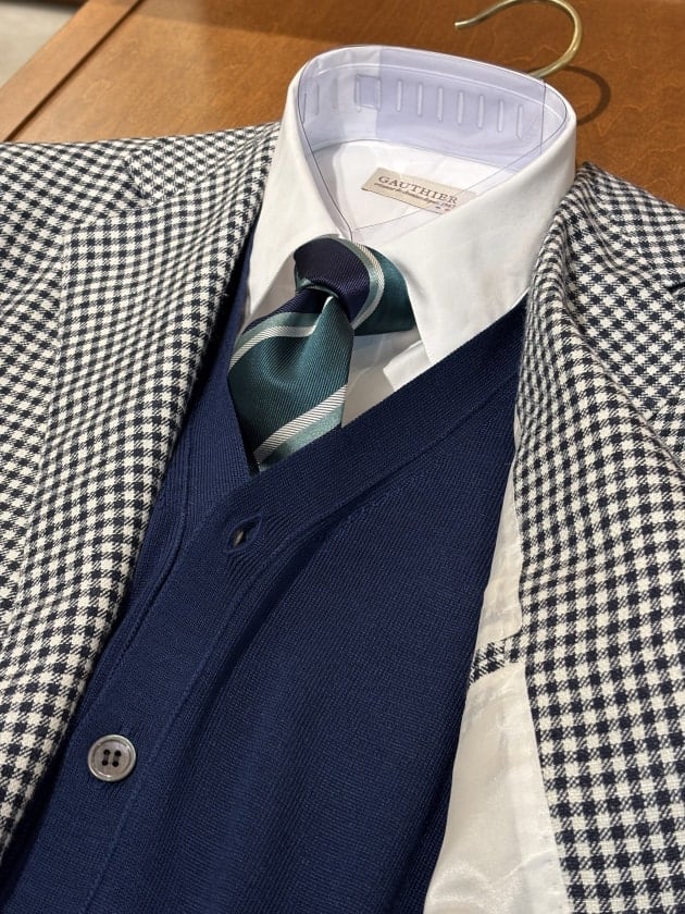 やはり重ねたくなりませんか?<SLOANE>のタートルネックカットソーを合わせました。最近はタートル・モックネックカットソーがいろいろありますから、その辺りのアイテムとレイヤードして頂くと今風なのかなと。