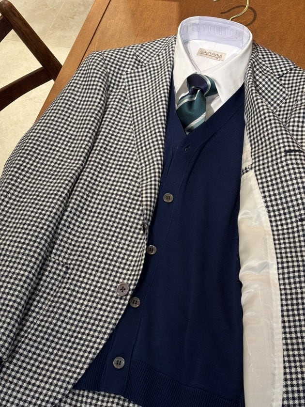 襟元の感じがポイントですね。ジップを上げてシンプルに着用するのもアリですが、