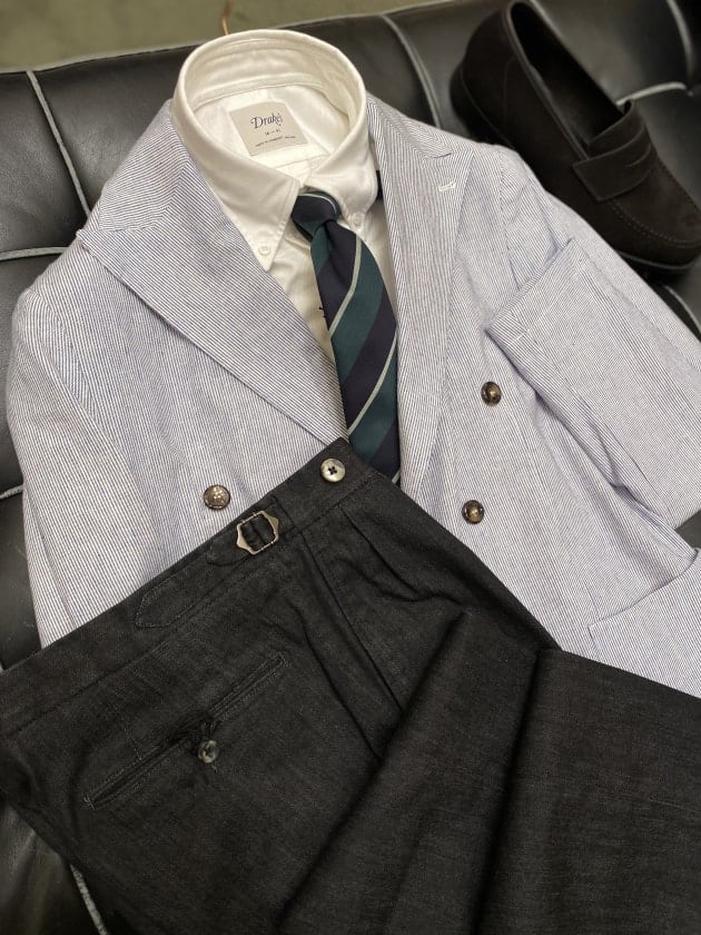 シューズはコーデュロイジャケットの生地感に合わせてスエードを。