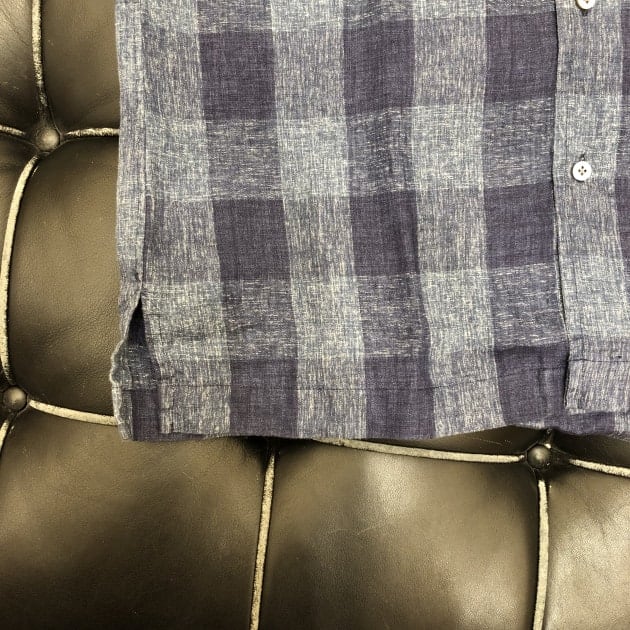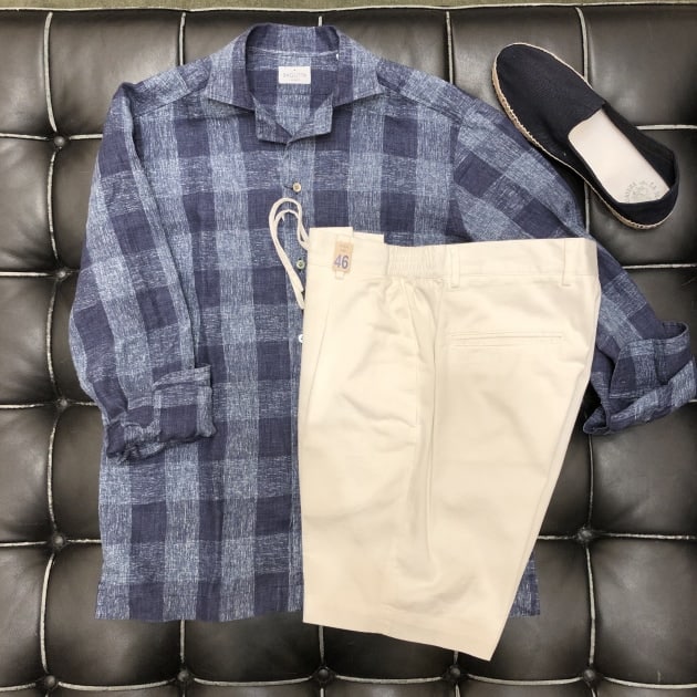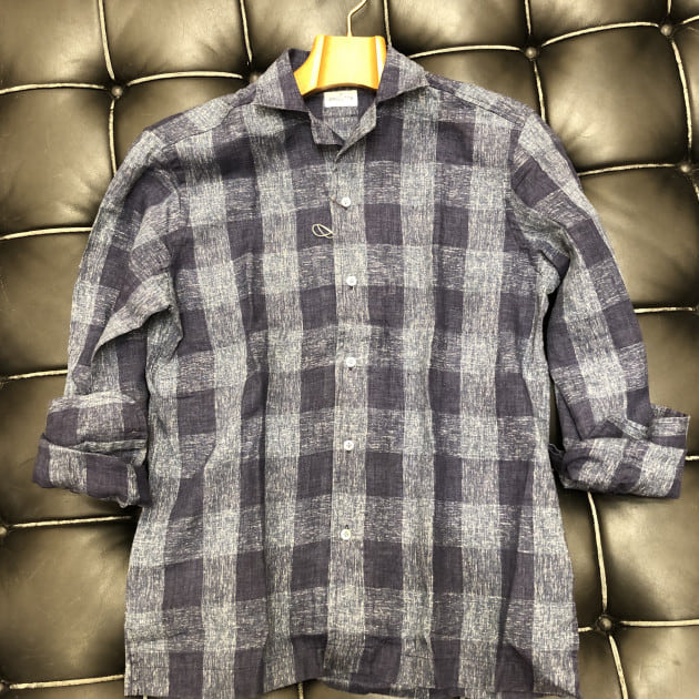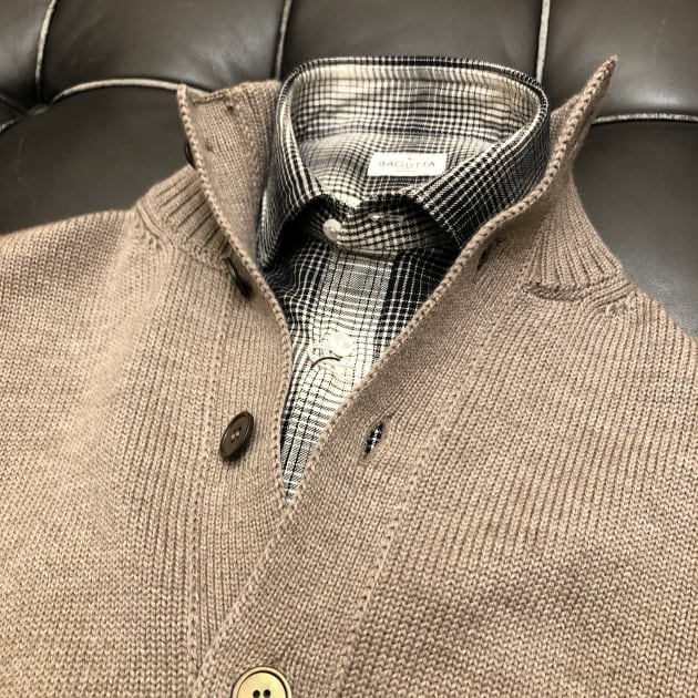 タッタソール柄のタブカラーシャツをノーネクタイ×ニットスタイルで、抜け感と小洒落た印象を。