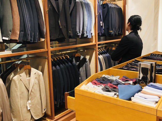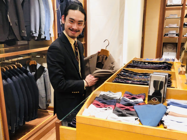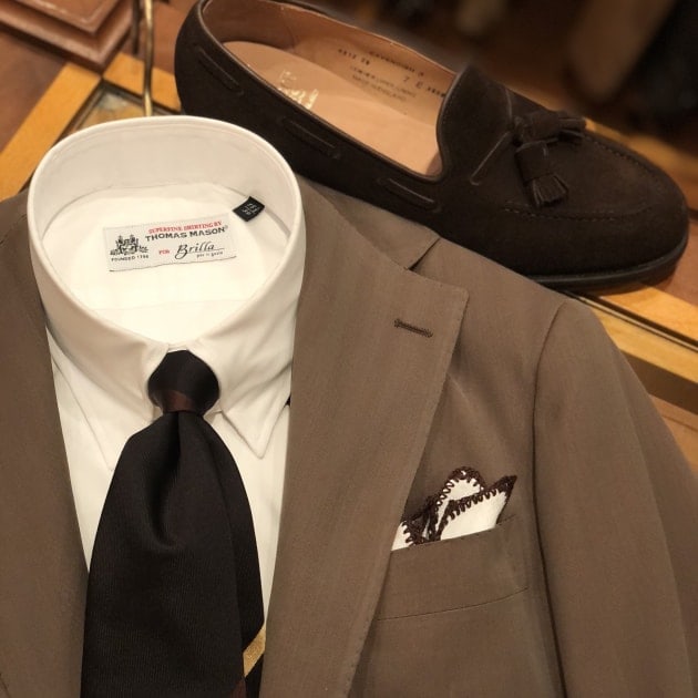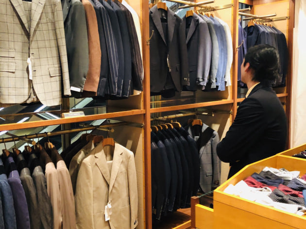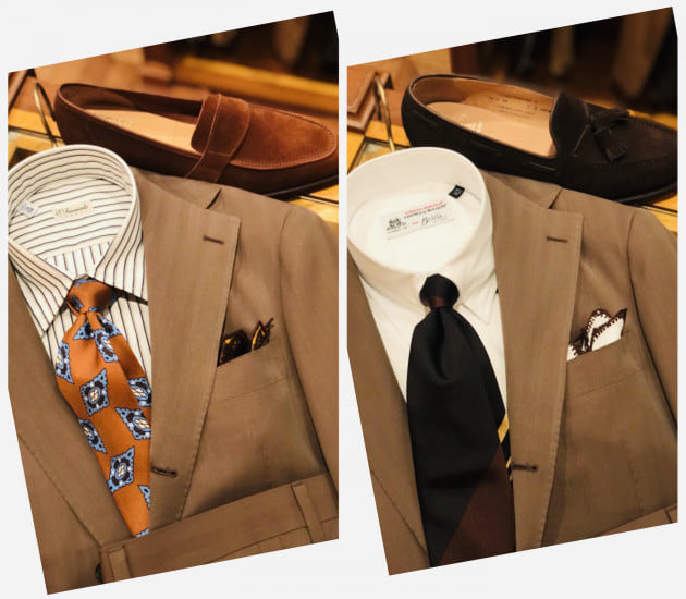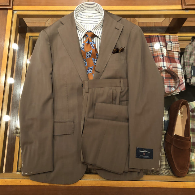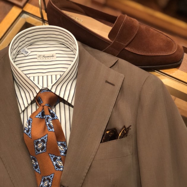 ベースのスーツは〈Stile Latino〉。ブランドらしい美しい曲線と柔らかくも重厚感ある佇まい。”普通”のネイビースーツとは一線を画した存在感を放ちます。