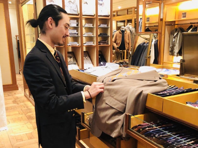 そんな存在感抜群のスーツをさらっと軽く装うのが高橋流。色を多用せず、Vゾーンはシンプルなネイビーのグラデーションで構成。
