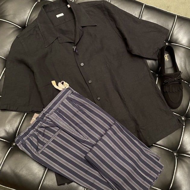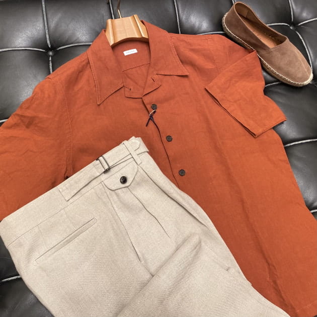 全体的にラフな装いですが、鮮やかなニットシャツカーディガンによってグッと洒落感と品の良さが漂うルックスに。