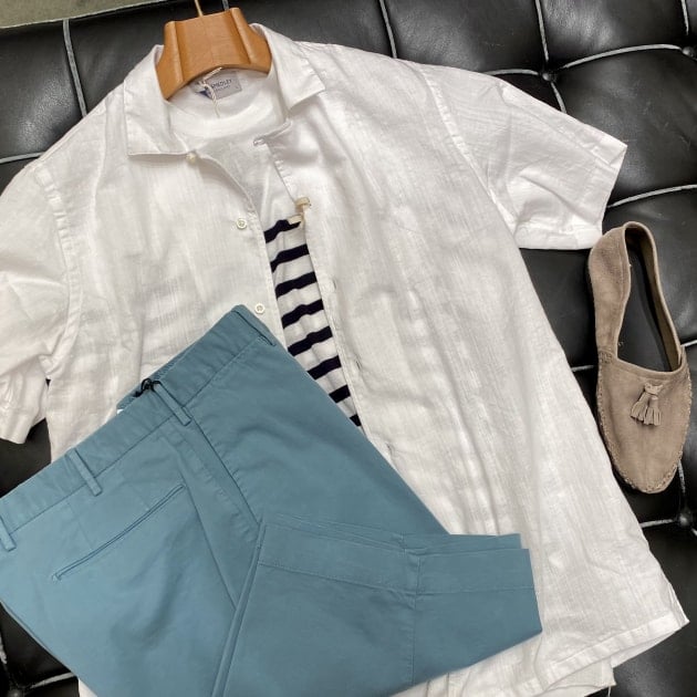 パンツは〈BARNSTORMER〉のドレスコットンチノ。真っ白ではなくオフホワイトをチョイスする事で、鮮やかなブルーグリーンの色味を馴染ませました。