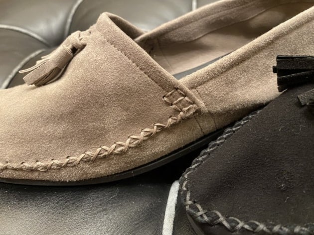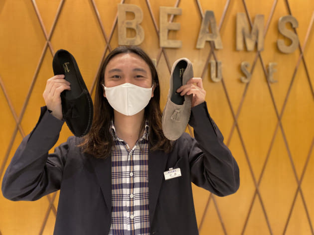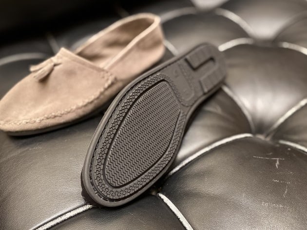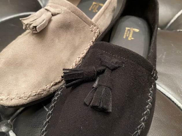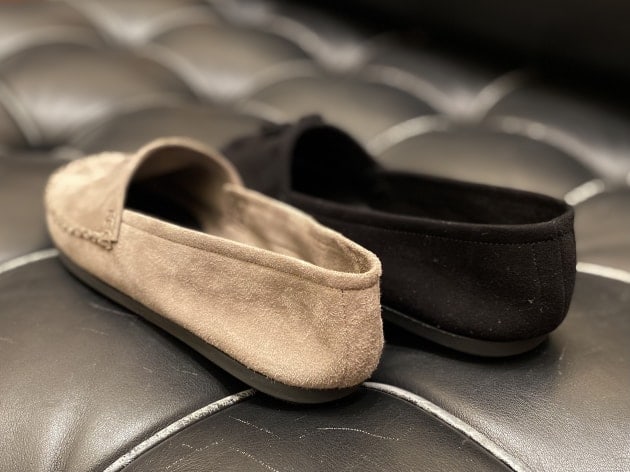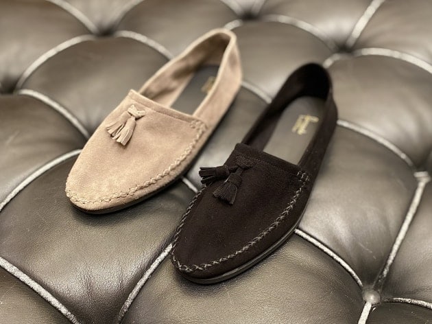 シューズは〈Ferrante viaggio〉のモカシンタイプのルームシューズ。リラックス感のある軽やかな作りですが、上質なシボ革によるエレガンスな佇まいがしっかりと品をキープ。軽い装いにはこの位華奢なシューズが重宝しますよ。