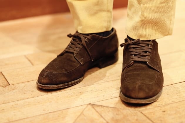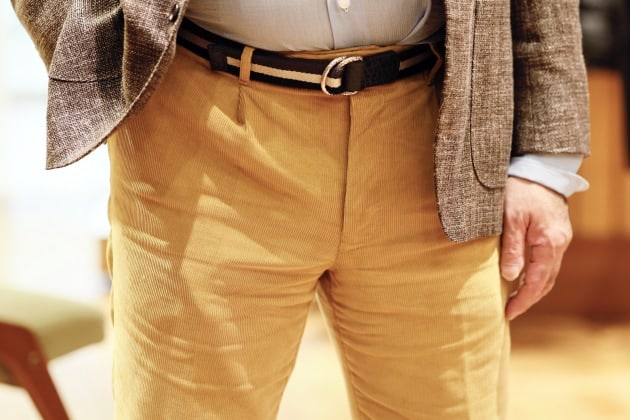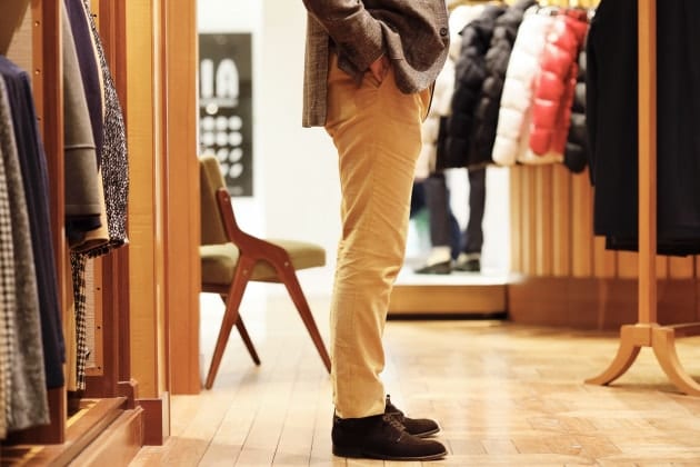 少し男クサいカラーリングでまとめても良いですね。セオリーなら5ポケットやチノを合わせていくところですが、敢えてウールパンツを持ってきています。
