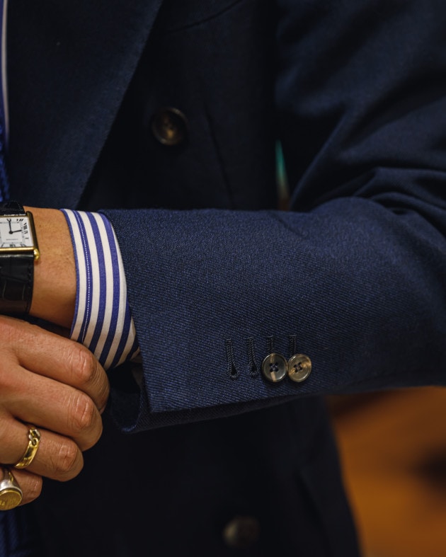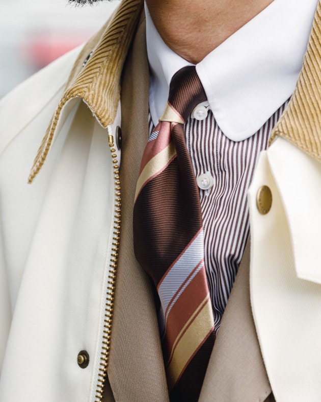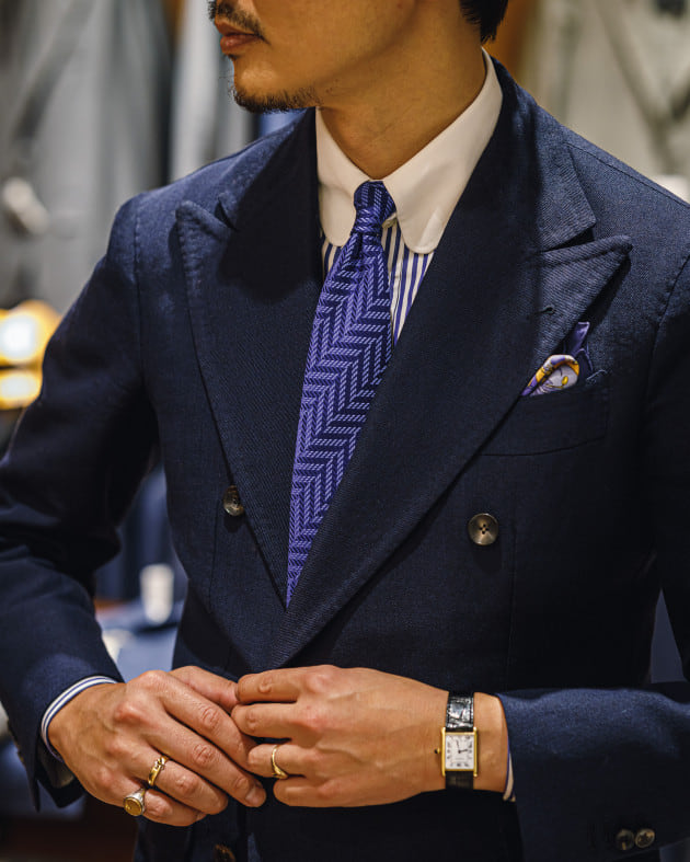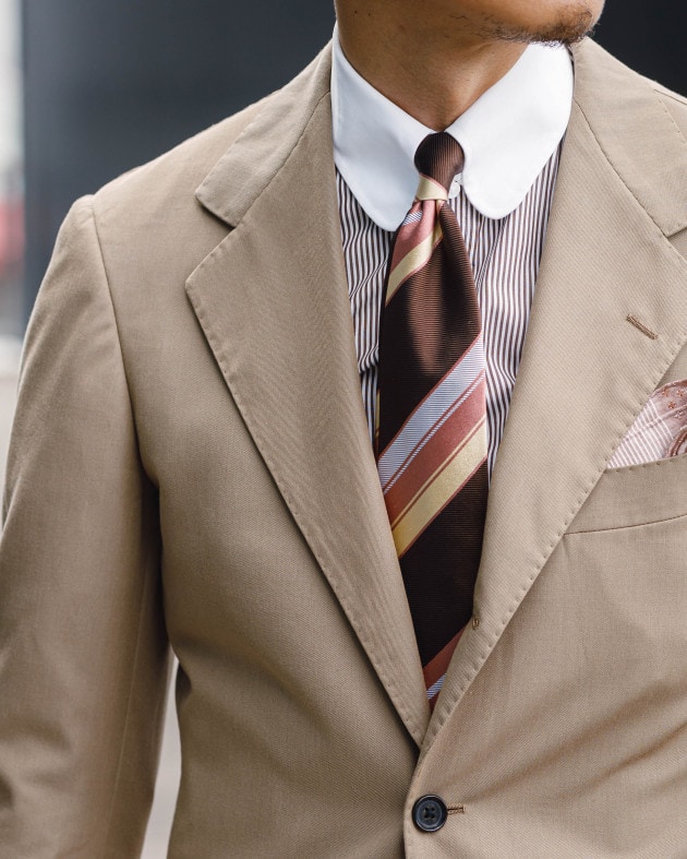 Vゾーンはラウンドタブにレジメンタルタイでストライプを重ね、動きをつけて。淡いコーラルピンクのアクセントが柔らかくエレガントな品格を演出。