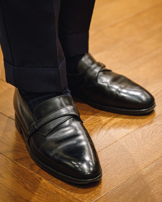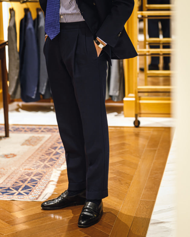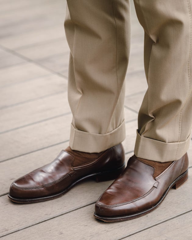 足もとはブラウンのエプロンフロントローファーでクラシカルかつクリーンに仕上げて。さりげなくつなげたソックスも流石のバランス感。