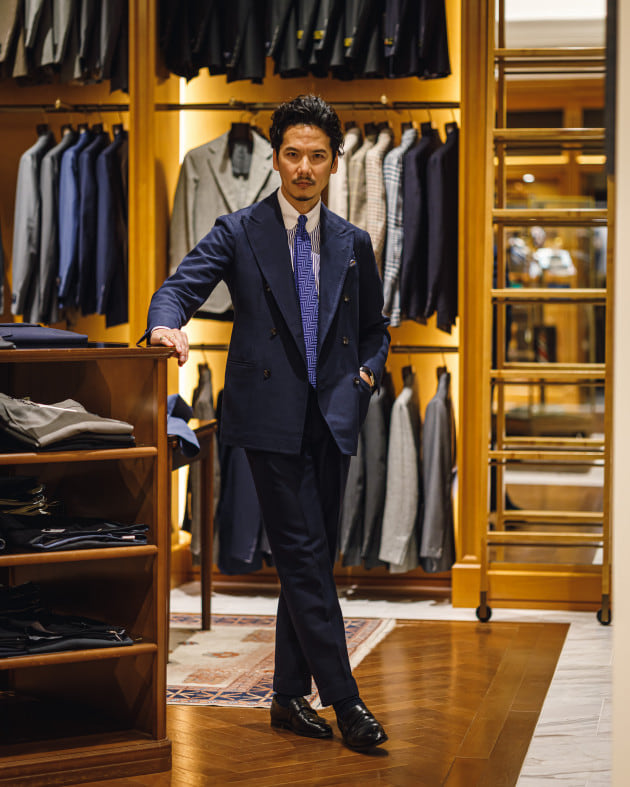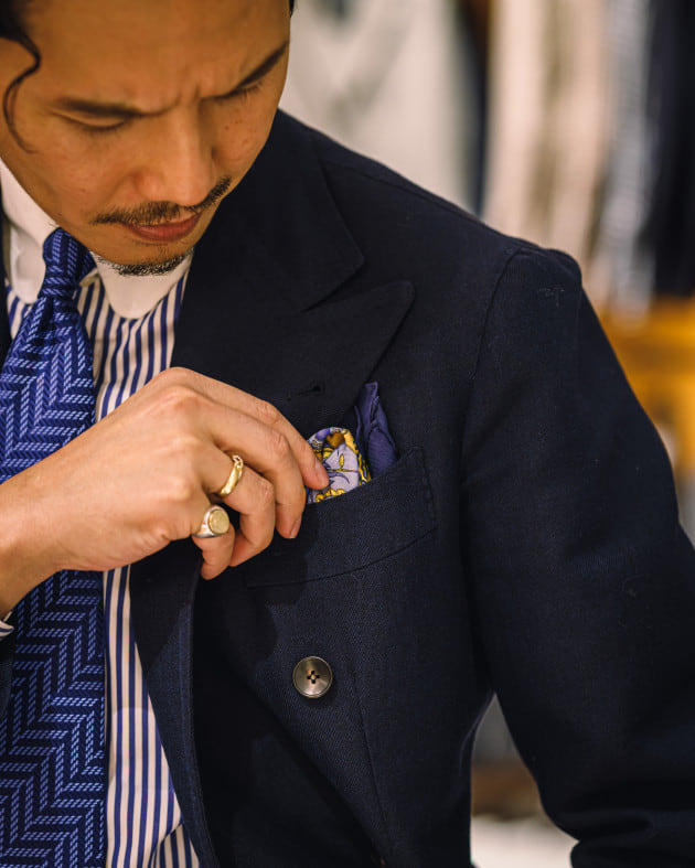 低く、なだらかな弧を描くゴージが特徴的なスーツは〈BEAMS F〉のハンドメイドラインの一着。フィレンツェスタイルを踏襲し、型紙からシルエット、ディテールの細部まで拘り尽くした渾身のモデルです。