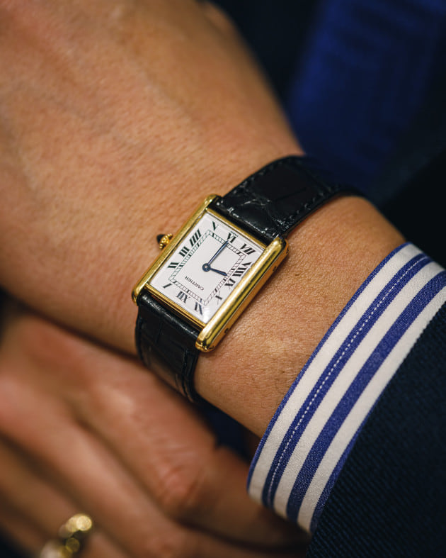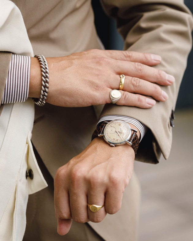 一切手を抜かない、動きをつけたアクセサリー使いもこなれて魅せるポイント。ゴールドとくすんだシルバーの表情がスーツの邪魔をせず、存在感をより引き立ててくれます。