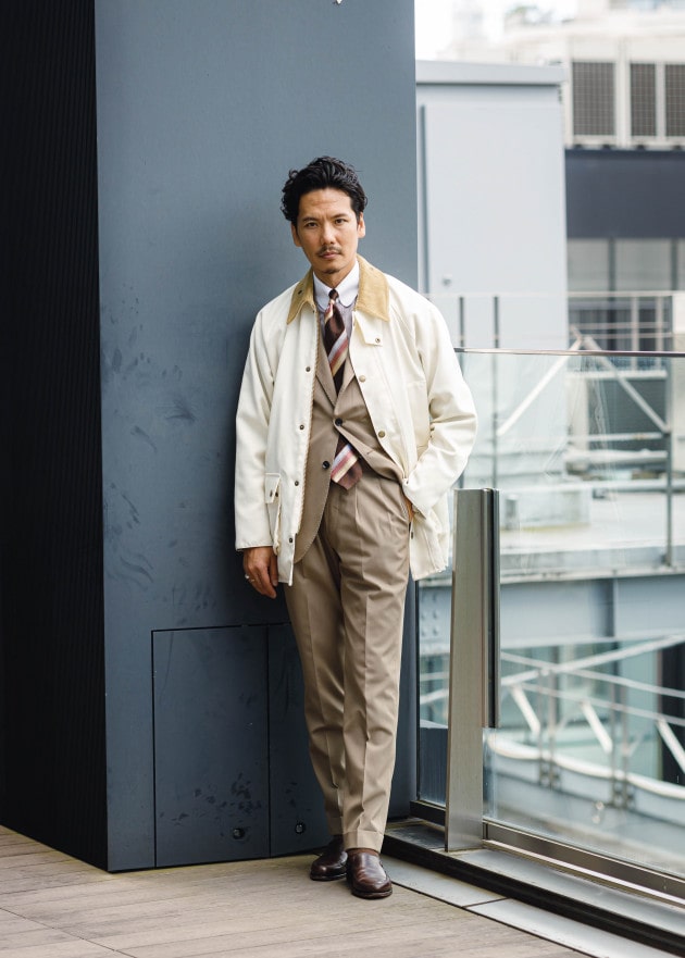 品のある色出しのベージュのスーツにホワイトの〈Barbour〉。襟のイエローベージュ、タイのブラウンとのグラデーションがスポーティでありながら非常に上品に映ります。