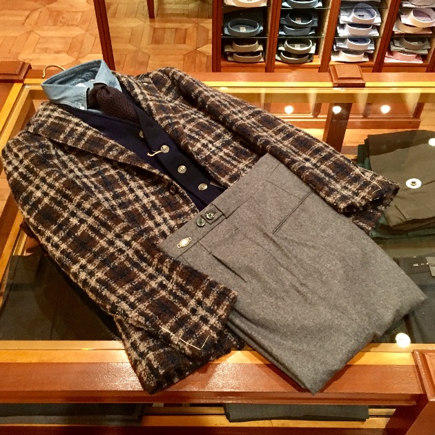 がっしりとしたウールのキャバルリーツイルに、温かみのあるニットを合わせてカジュアルに。