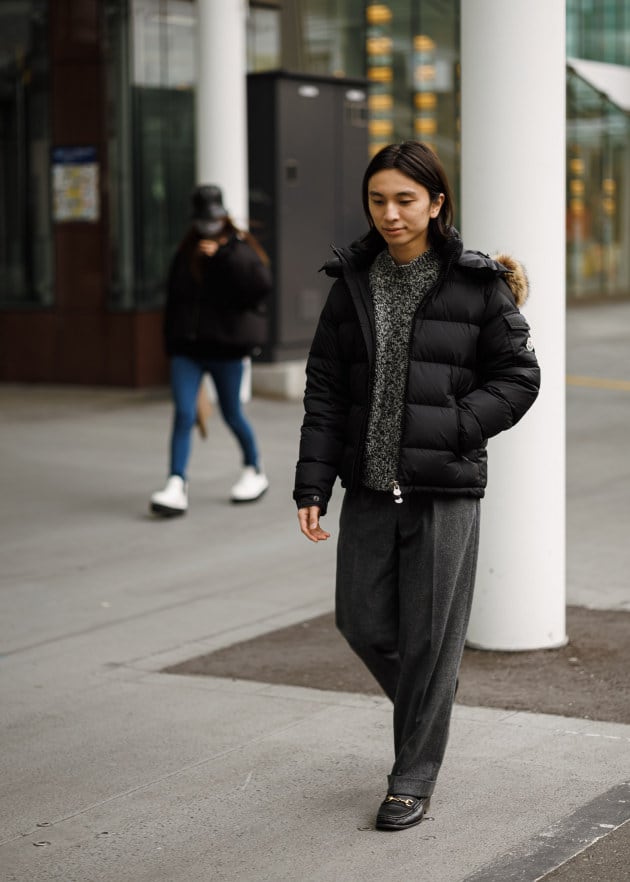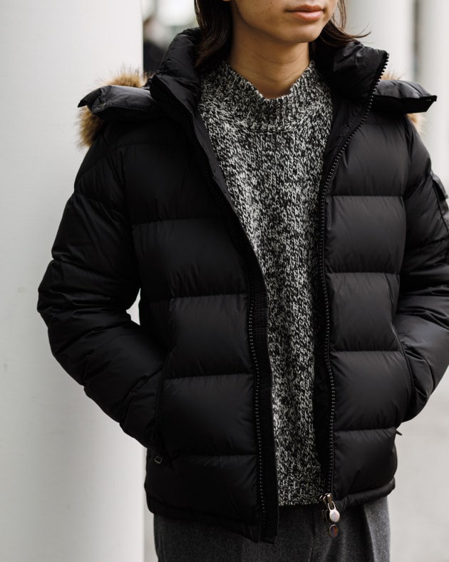 シャイニーですね。中綿ダウン量の多いモデルですが、着てみるとそれほど着膨れして見えませんよね。サイズ感はある程度ジャストでお召し頂いて、スッキリ目に見せた方がカッコいいのではないでしょうか。ご参考まで。