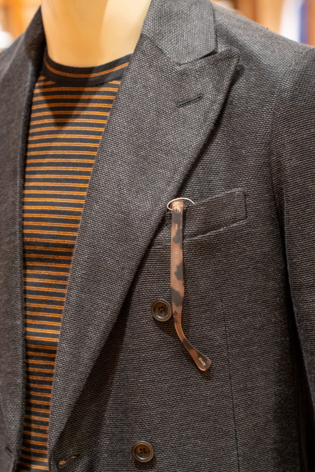 チーフを挿せる胸ポケットも付いていますが、こんな感じでサングラス(今回はリーディンググラスですが)がちょうど良い塩梅です。