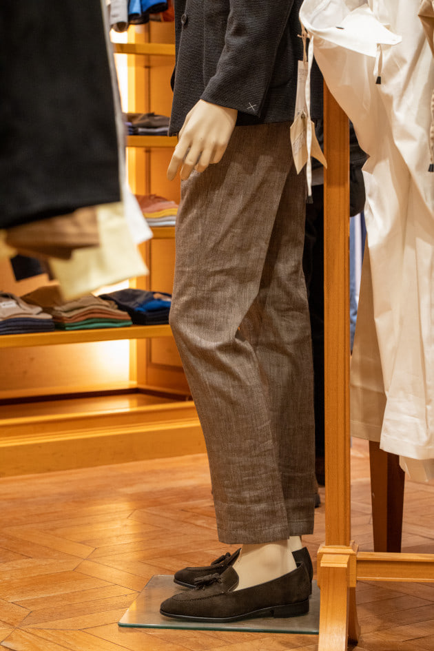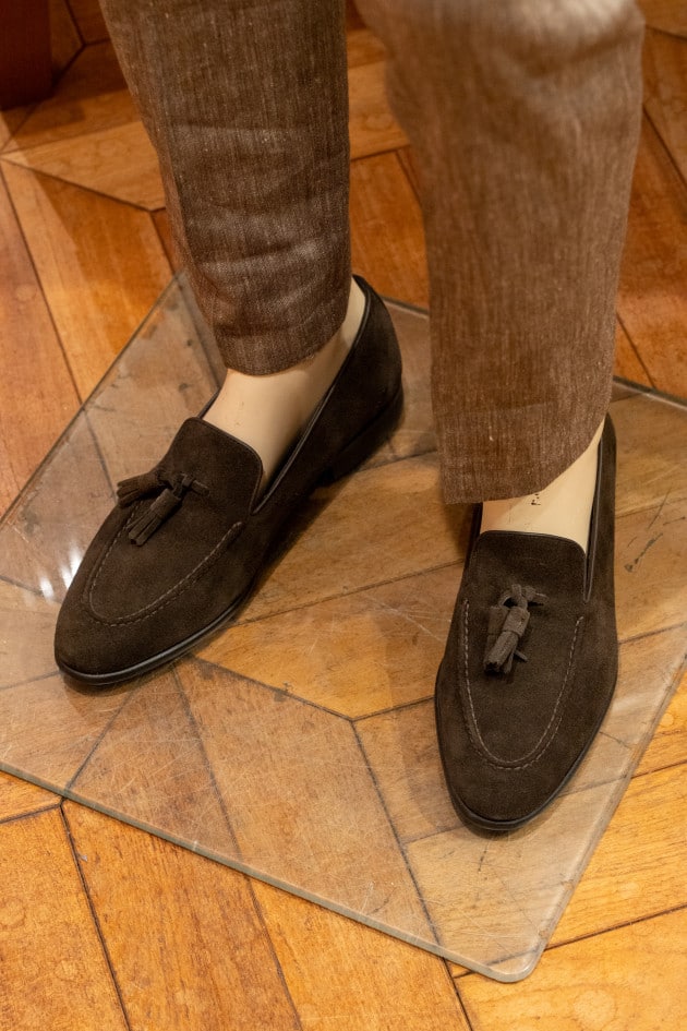 足元は素材感合わせてスエードのタッセルローファー 。