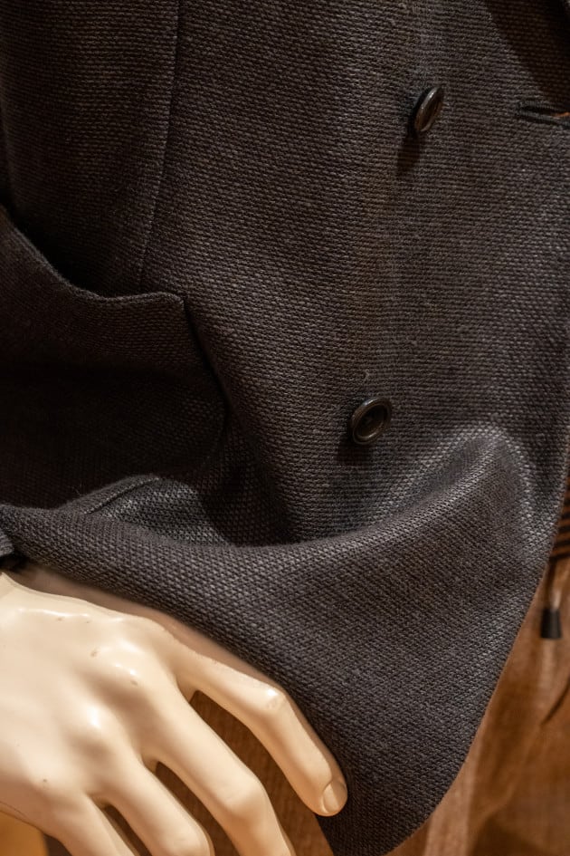 ダブルのジャケットですが、ボタンを留めてお堅く着用するよりはこんな感じでボタンを開けてカーディガンのような感覚で着用していただきたいですね。