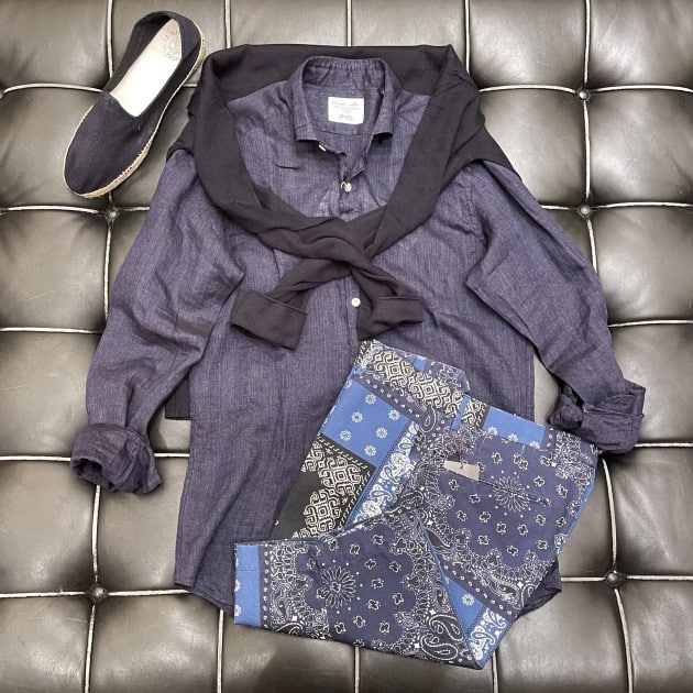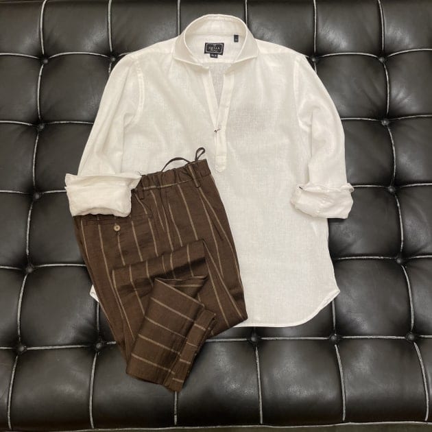 パンツはワイドなシルエットのものでリラックス感を表現。リネンの素材も清涼感のあるルックスに。サイドアジャスターのディテールでクラシックなテイストも入れています。