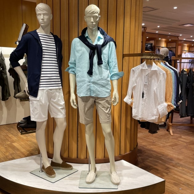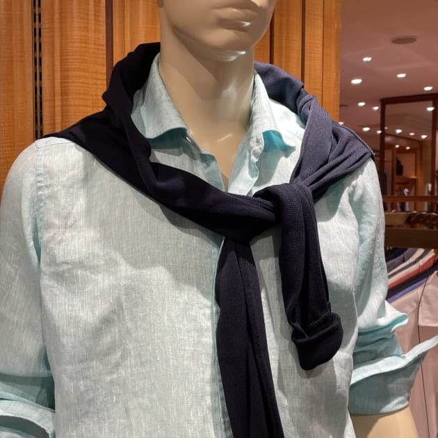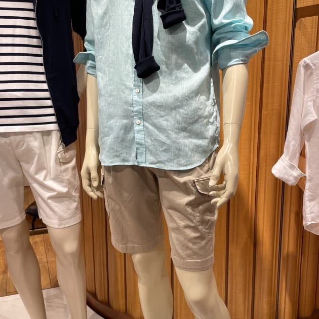 こちらのコーディネートではインナーのポロのサイズ感をやや上げることがポイント。少しゆったりとしたフィッティングで裾をブラウジングすると、こなれた雰囲気に仕上がります。ネックのサイズ感も緩めに設定して、ネッカチーフをふわっと巻くのがおすすめだそう。