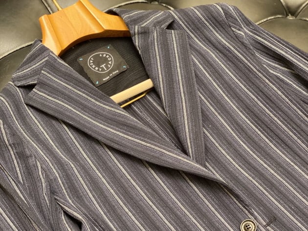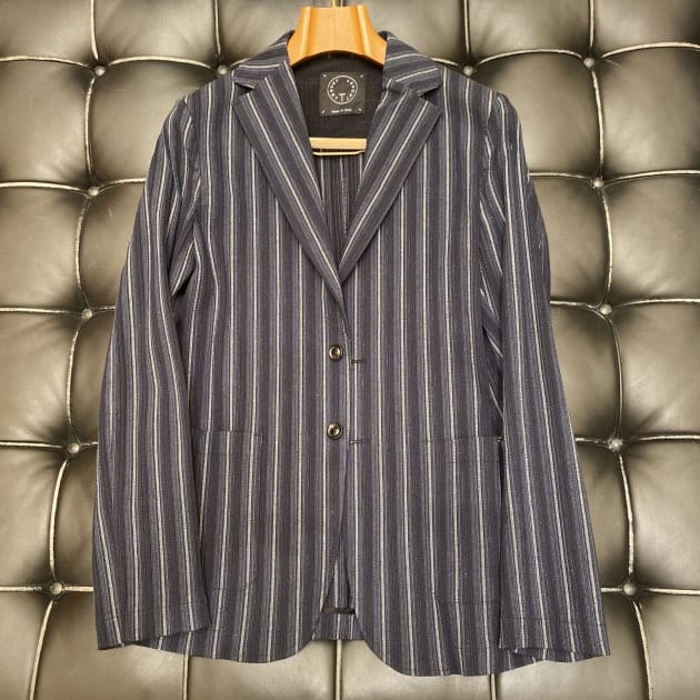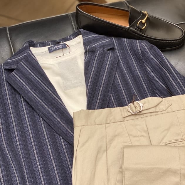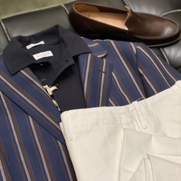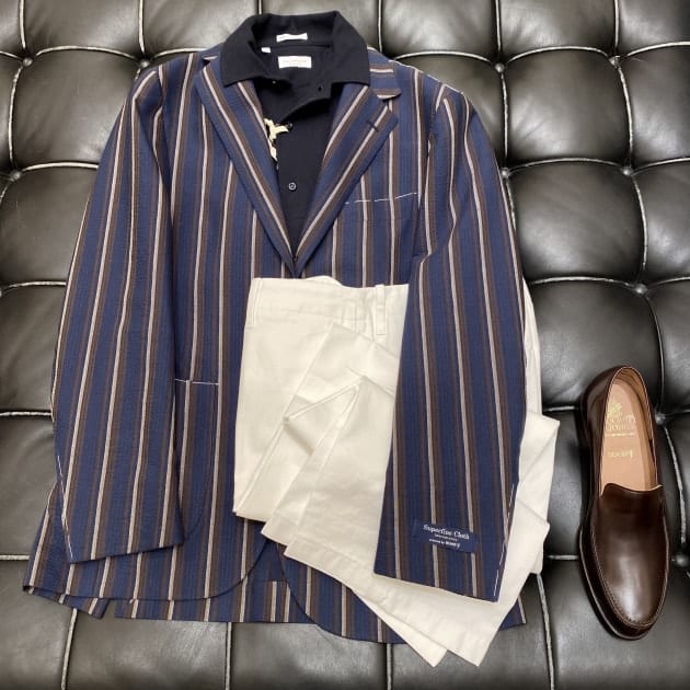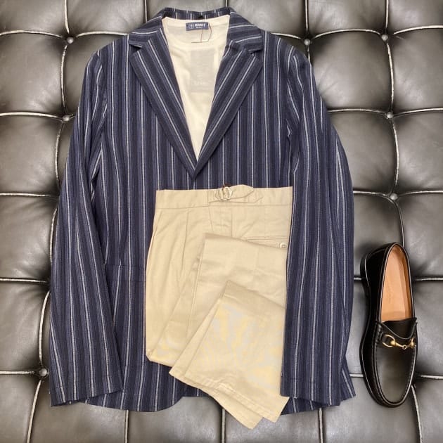 意外と既製品ではご用意の少ないネイビーストライプのジャケットを使用したコーディネート。
