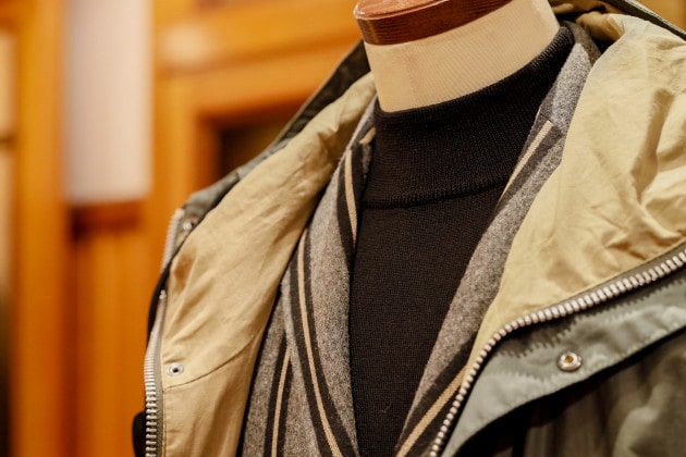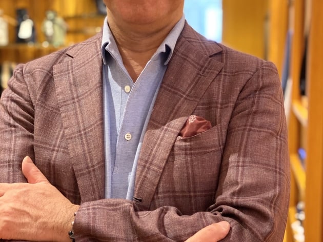 ネッカチーフとして使っているのは実は<Dieffe Kinloch>のハンカチ。