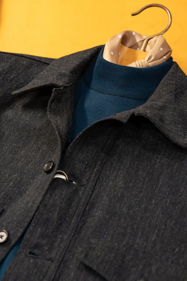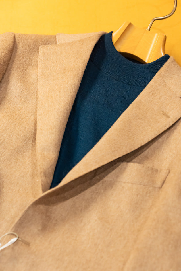 程良く首周りをホールドするモックネックはそのまま着用するのはもちろん、間にネッカチーフを挟むこともしやすいバランスです。着こなしに幅を出すことができるので、単調になりがちなニットコーディネートにも変化を与えやすいです。
