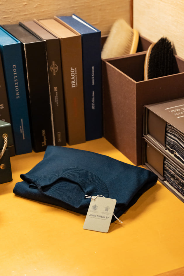 <JOHN SMEDLEY>はモックネックニット<KILDAY>。滑らかな肌触りのハイゲージニットです。