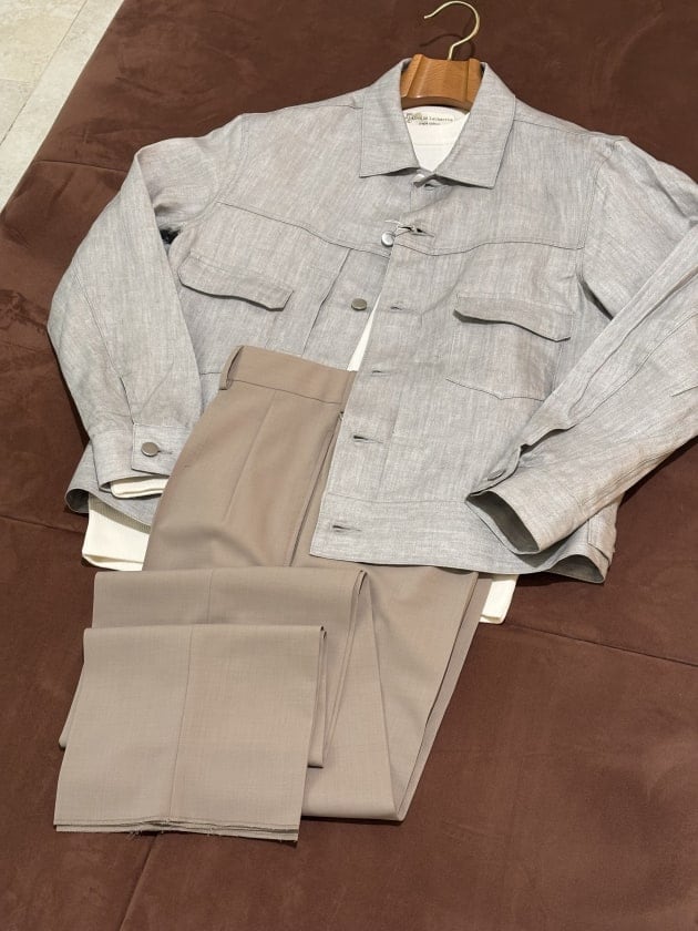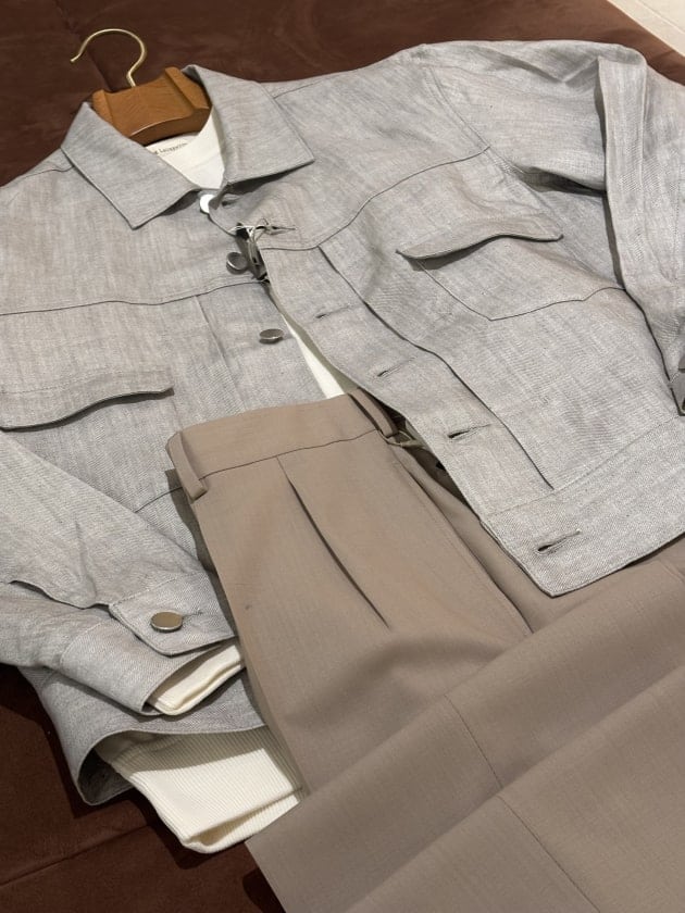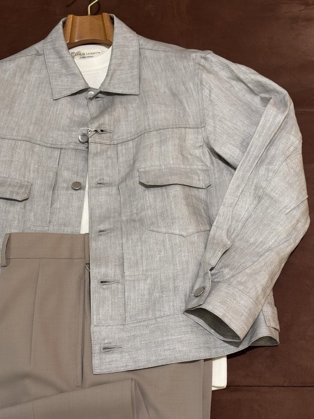 色合いが絶妙ですね。LT.GREYカラーのリネン。メゾンな雰囲気も感じられるクリーンな仕上がりです。