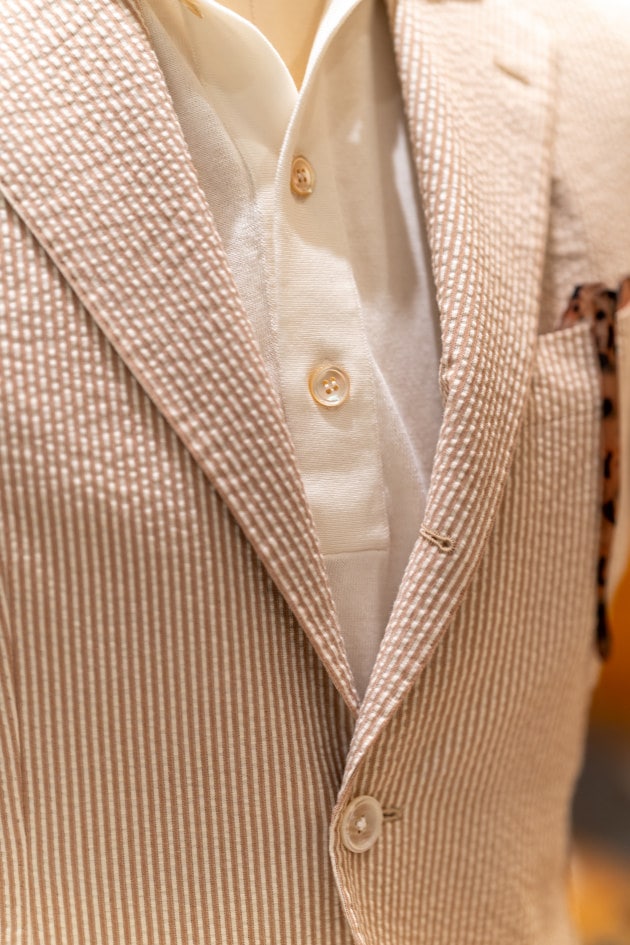 こんな感じのチラ見せで柄の面積を削ってあげることで柄物ジャケットの抵抗感を少なくすることもできます。というわけで重ね着するジャケットはこんな感じの柄物が個人的におすすめです。