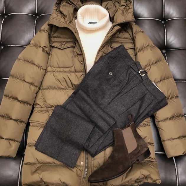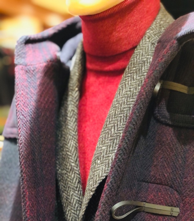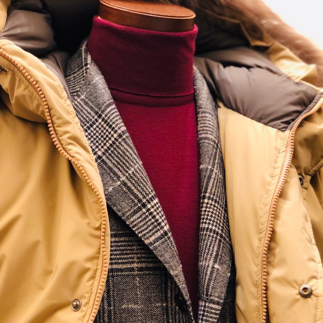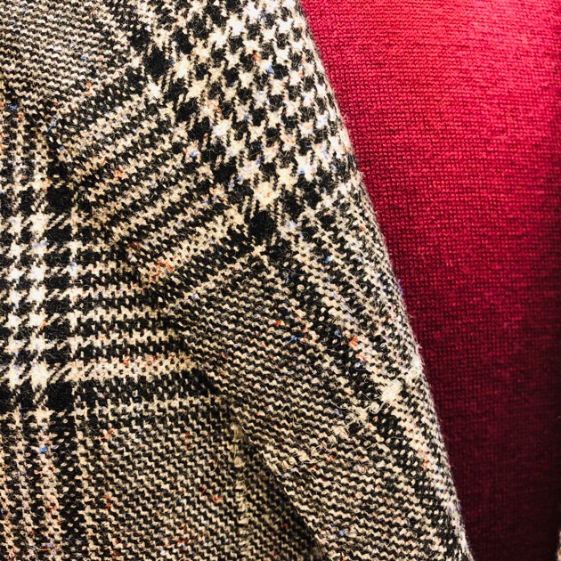 起毛感のほとんどない綺麗で都市感のあるガンクラブチェックなので、ブラウントーンだけでなく、ブラックなどとモダンに合わせてみるのも面白いかなと思っています。