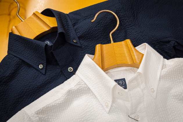 凹凸感のあるシアサッカー。肌への張り付きを軽減し、生地の乾きも早いです。唯一のネイビーカラーも魅力。
