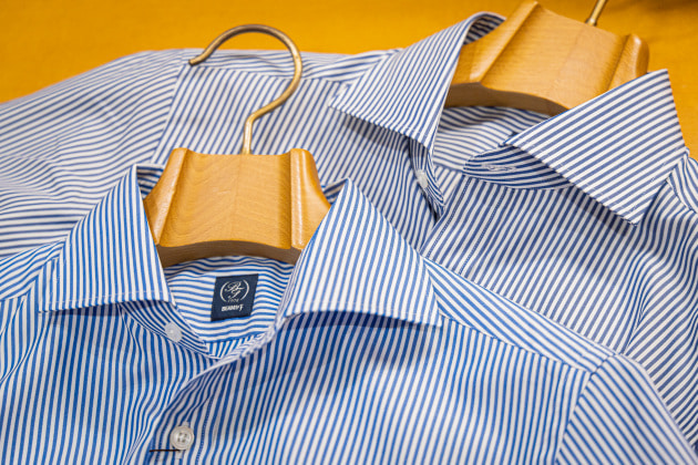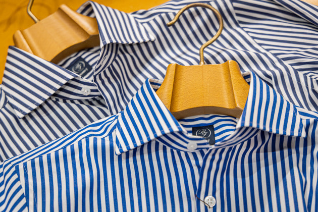 太めのストライプは力強くハッキリとした印象に。ノータイスタイルにも映える一着です。