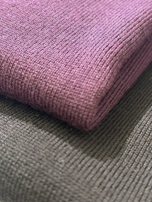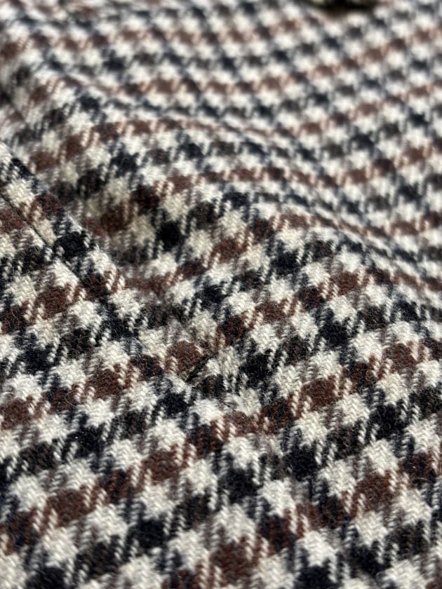 ウール90%ナイロン10%生地です。薄っすらグレイッシュでモダンな配色。柄ピッチが小さめなので、コーディネートに取り入れて頂き易いイメージの色柄です。
