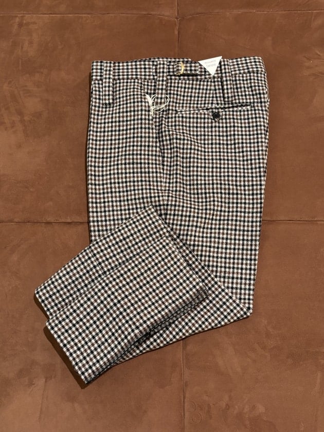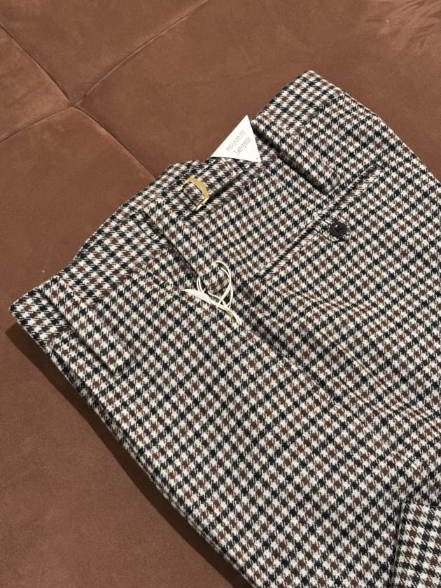 イギリス陸軍のオフィサーパンツ型をベースに作成された新規展開モデルです。バギーパンツのようなワイドストレートシルエット。洒落た配色のガンクラブチェック柄が特徴的なパンツです。