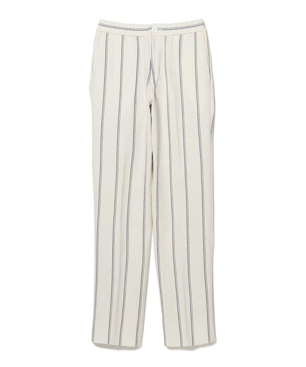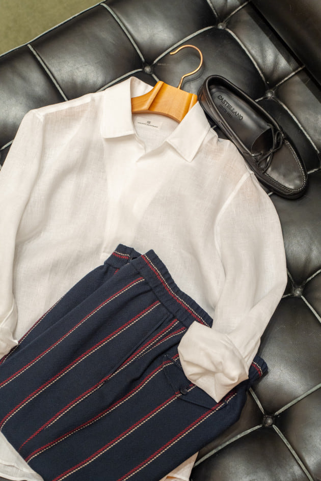 パンツのストライプがしっかりと映えるようにシンプルに白リネンシャツで。