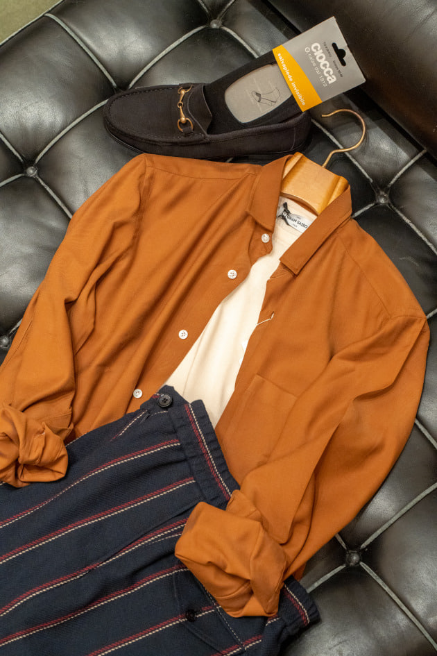 足元はサンダルでもいいですが、ブラックの軽いレザーシューズぐらいの方が街着としてリアルですかね。