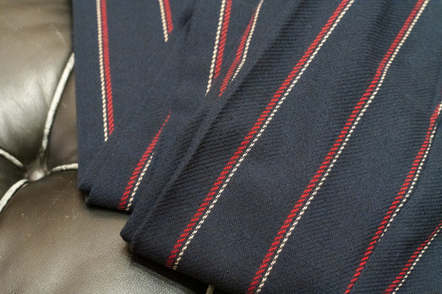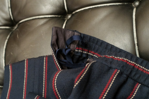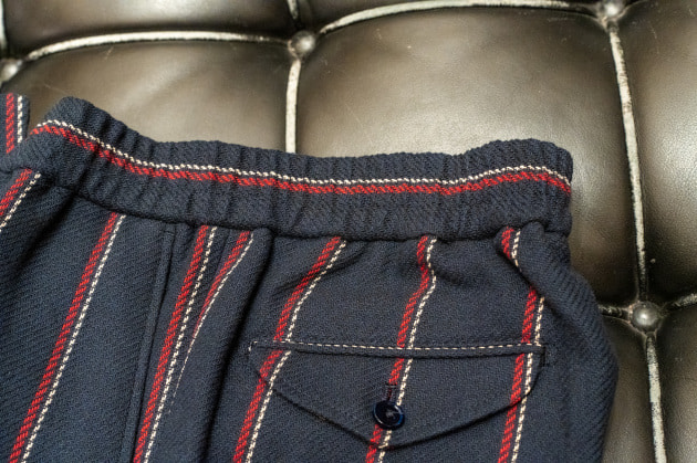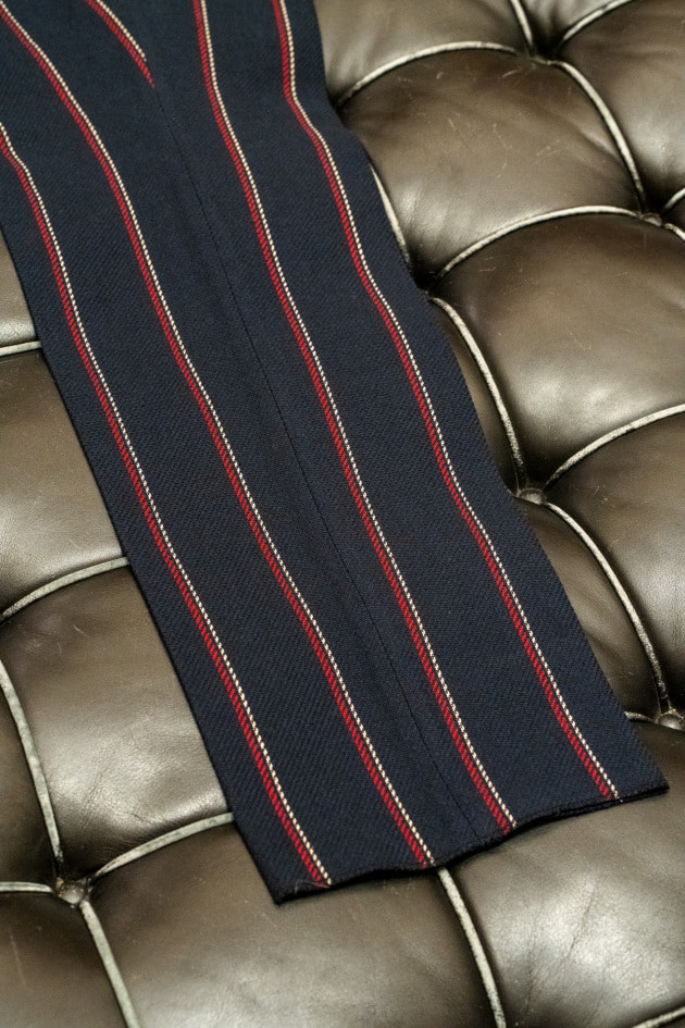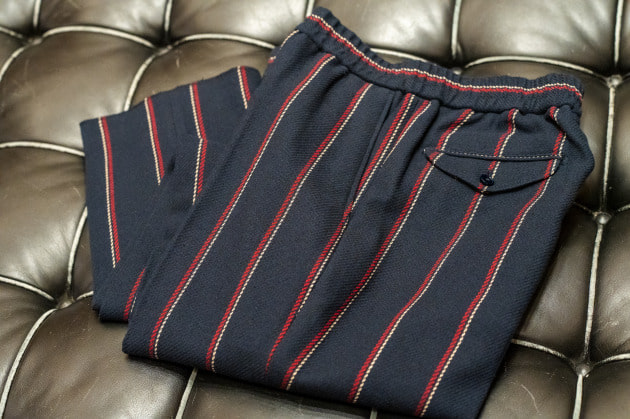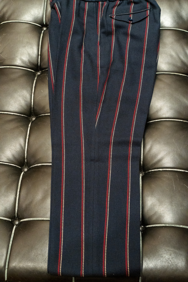 ネイビーベースに明るいレッドが特徴的なストライプパンツ。