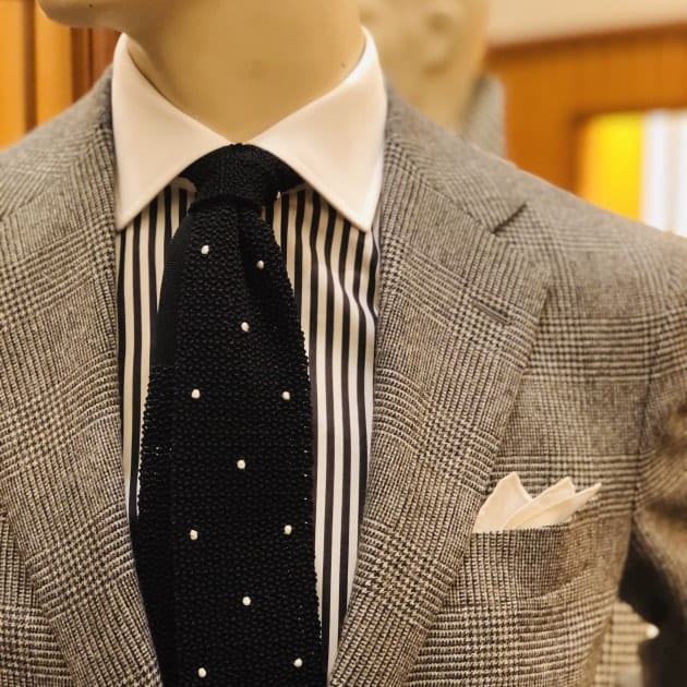 この日は<DALCUORE>のビスポークスーツにネイビーのレジメンタルタイのクラシックスタイル。