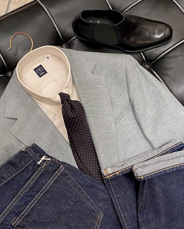 角のない柔らかな襟に比較的多い華奢な釦。力強くも柔らかなディテールがこなれたルックス。