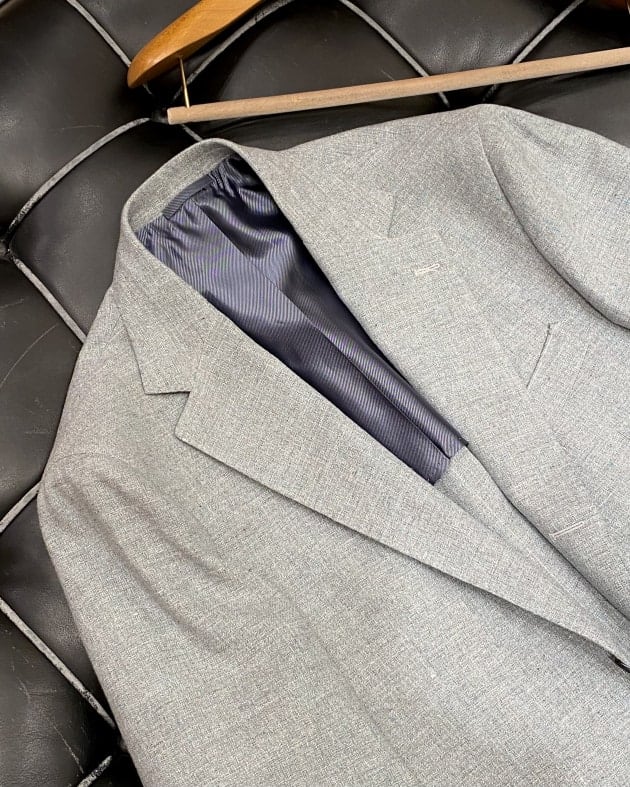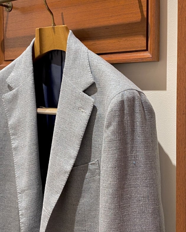 開襟タイプの襟に2つのフラップポケット、比翼仕立てのフロント釦が特徴で、カジュアル感とドレス感が良い塩梅でミックスされています。