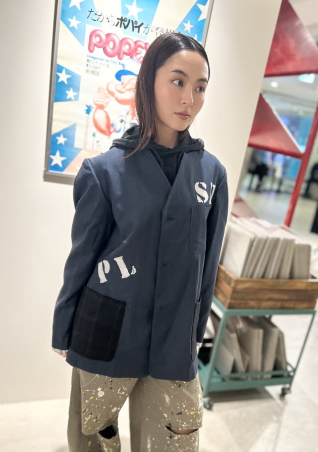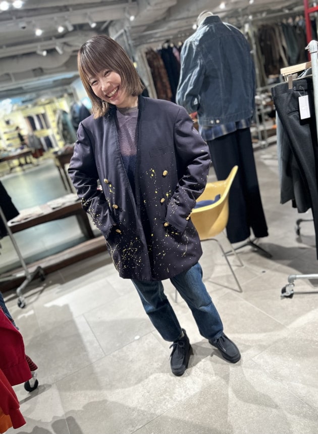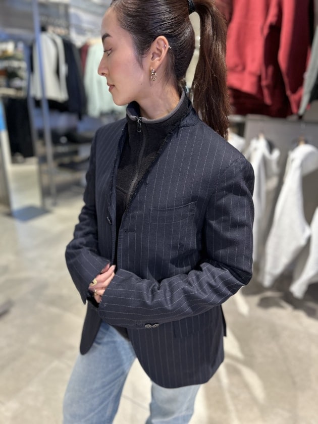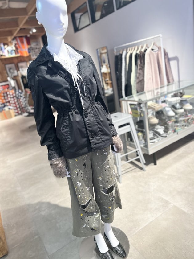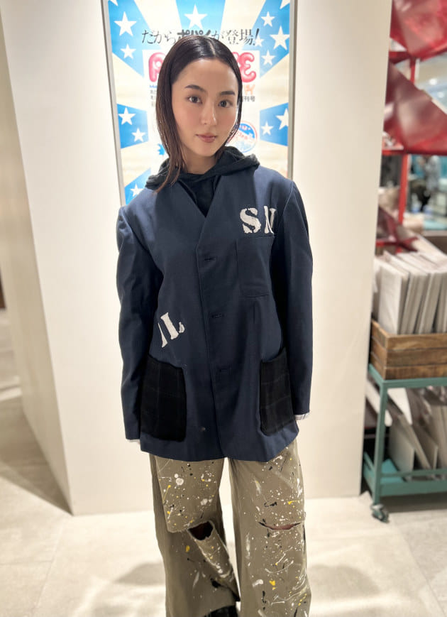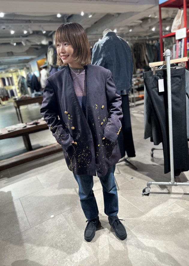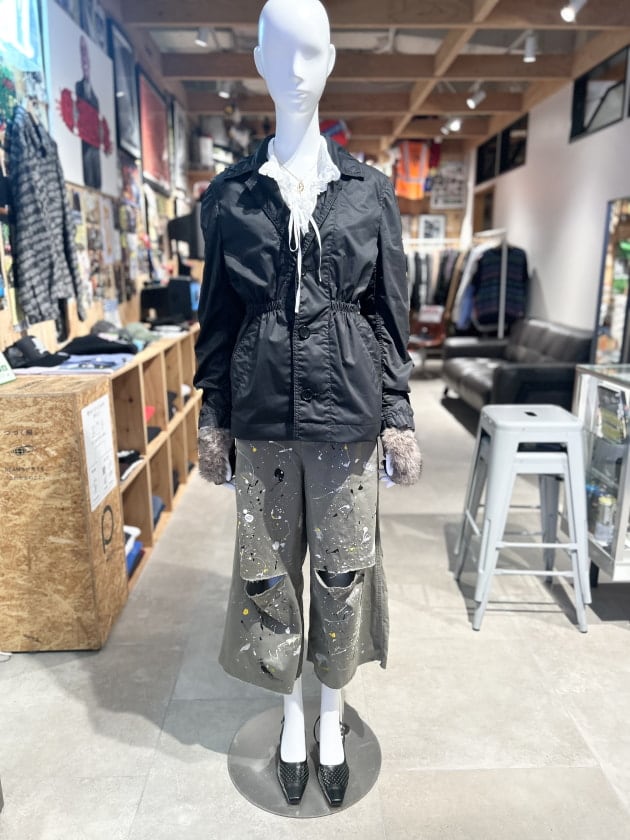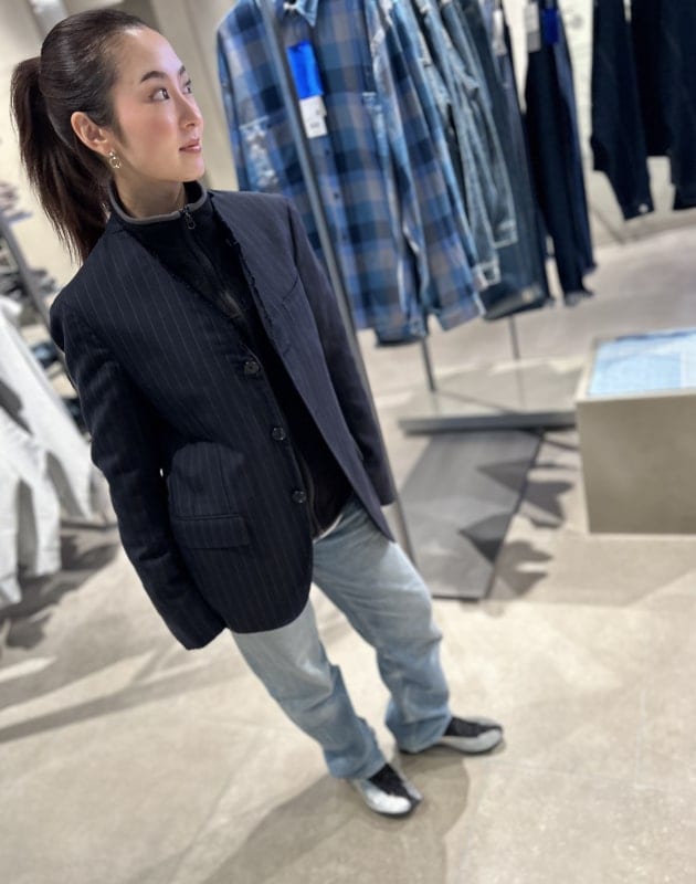 「女性らしいキレイめジャケットにあえてダメージ加工、ペイント加工を施したミリタリー調パンツを。パンプスを合わせて肌見せを忘れずに。芯のある強い女性像をイメージしたスタイリングです。」