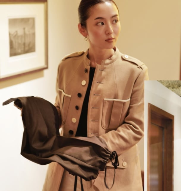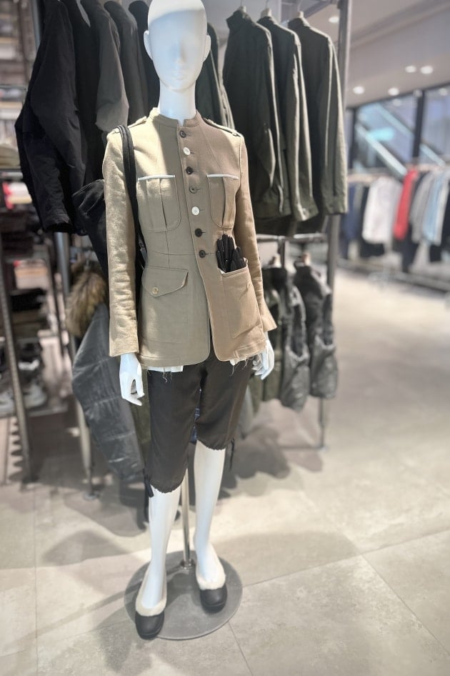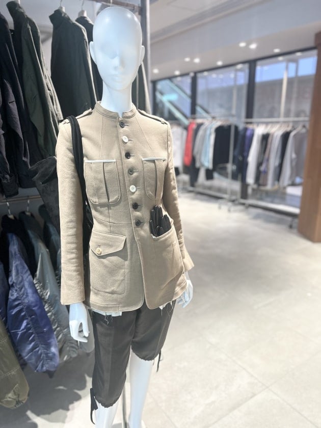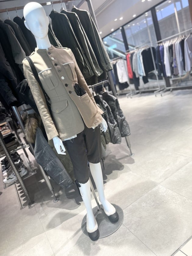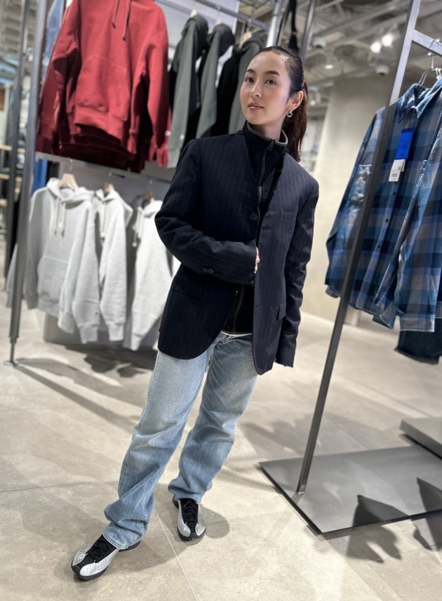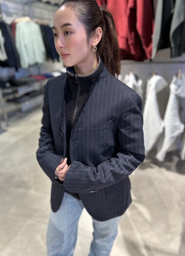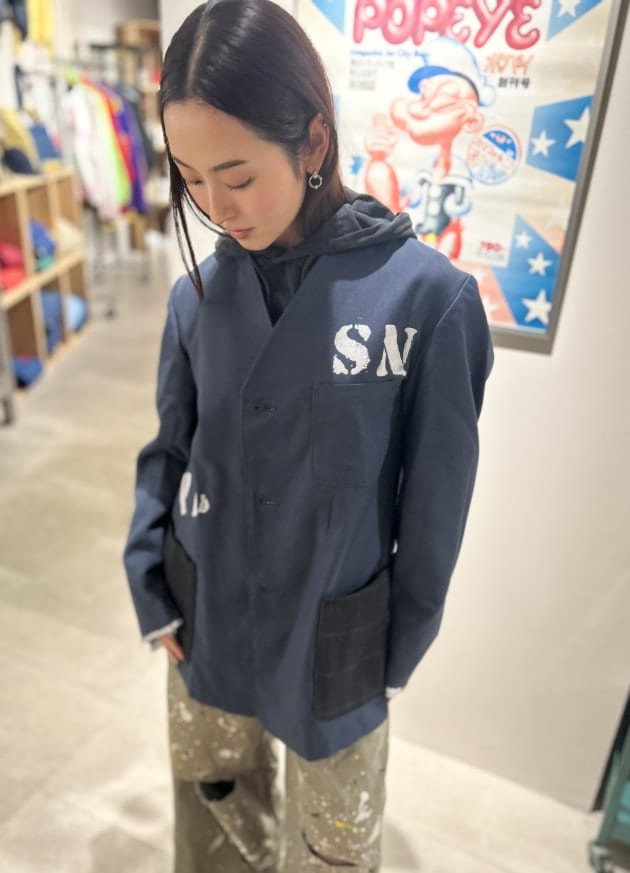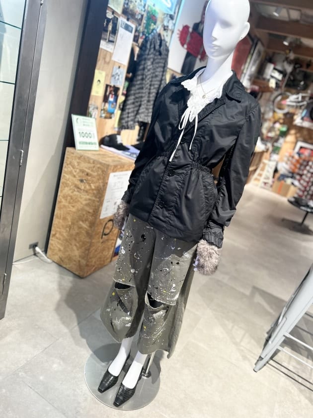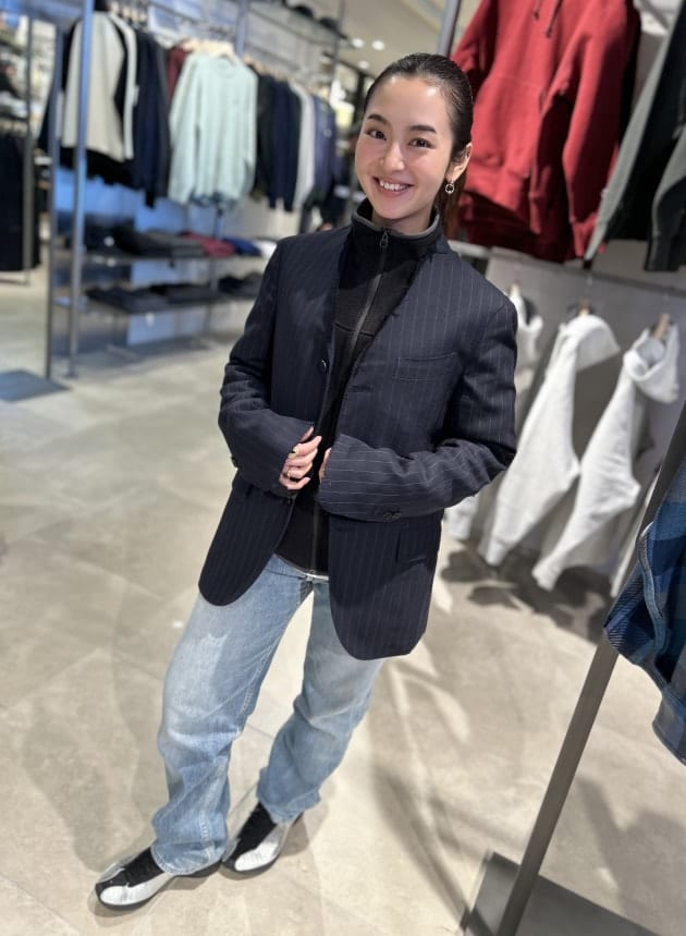 「女性らしいキレイめジャケットにあえてダメージ加工、ペイント加工を施したミリタリー調パンツを。パンプスを合わせて肌見せを忘れずに。芯のある強い女性像をイメージしたスタイリングです。」